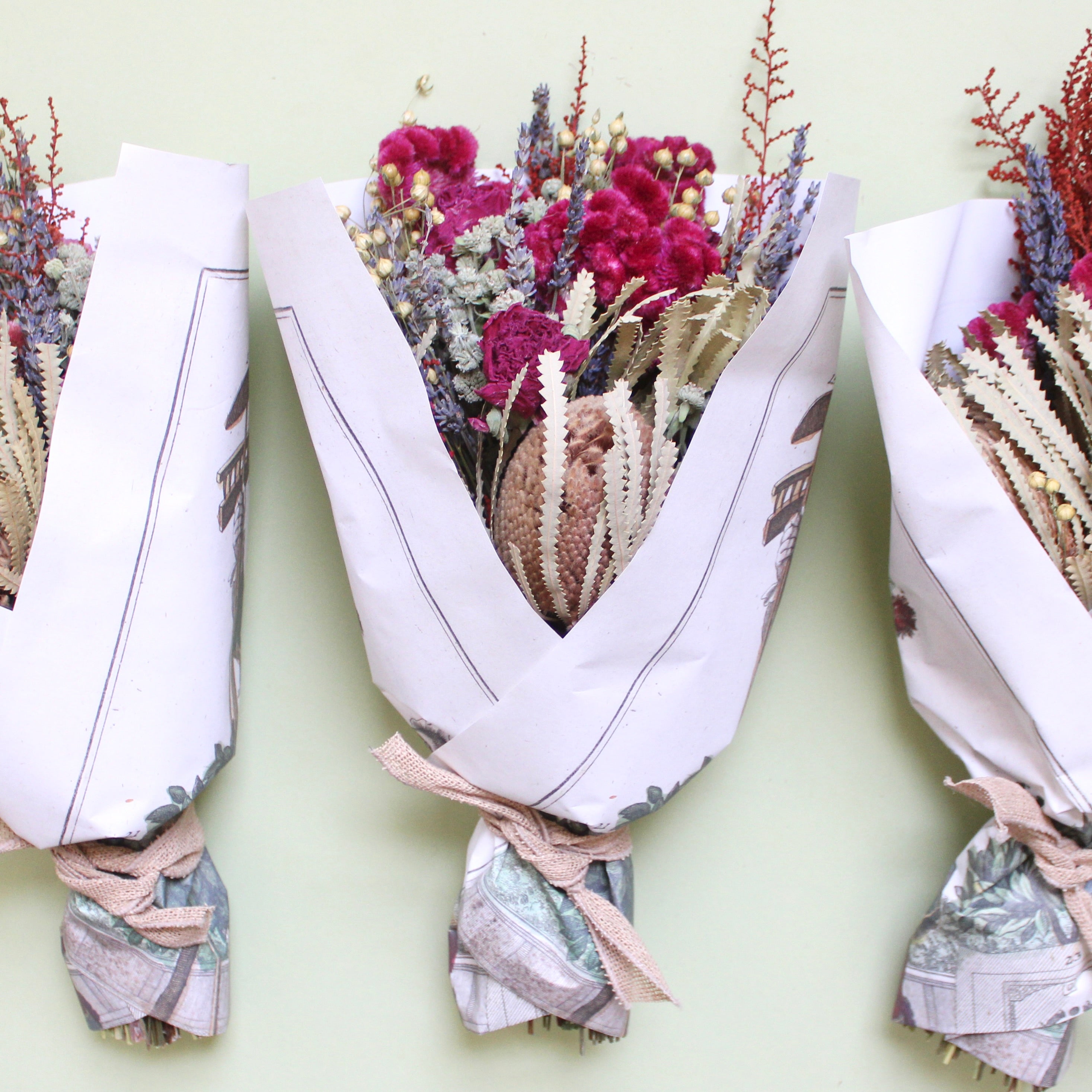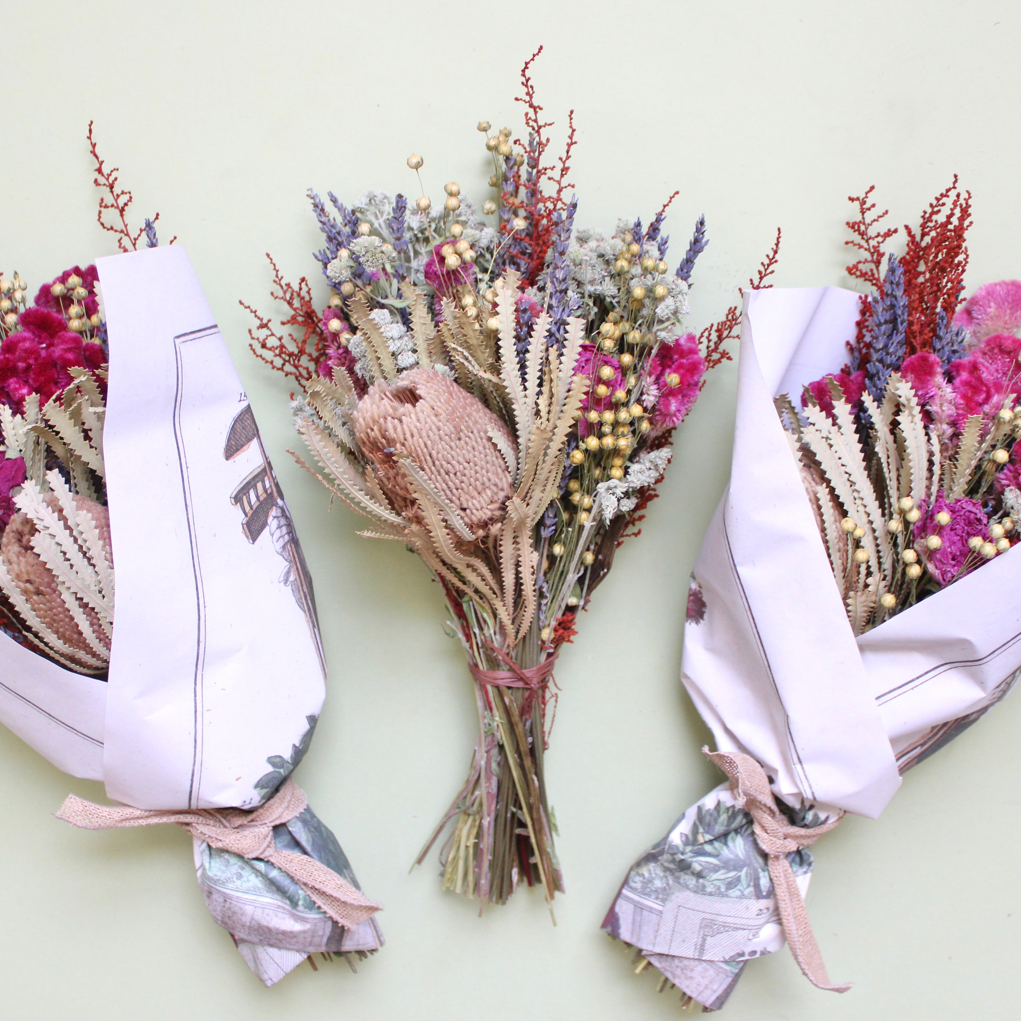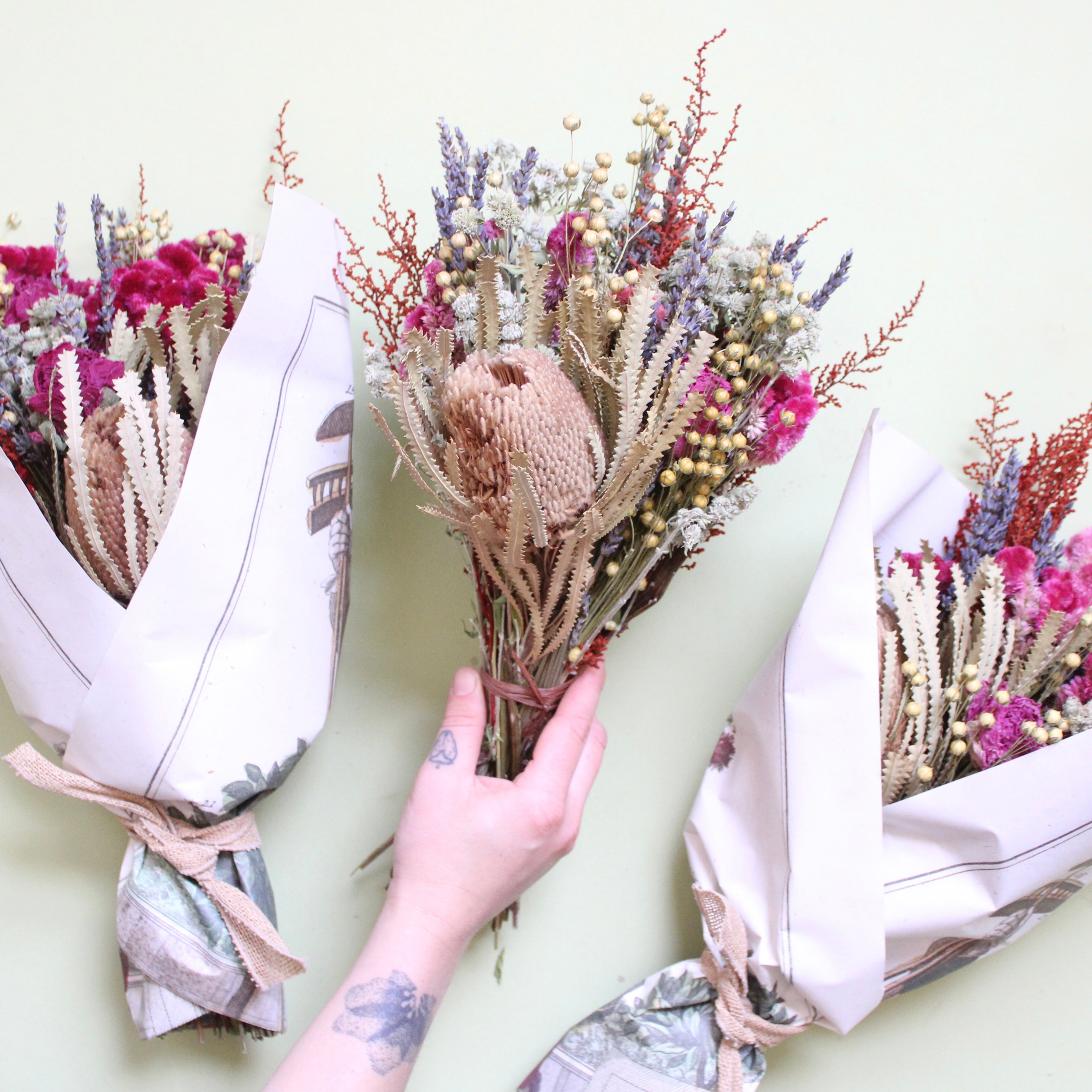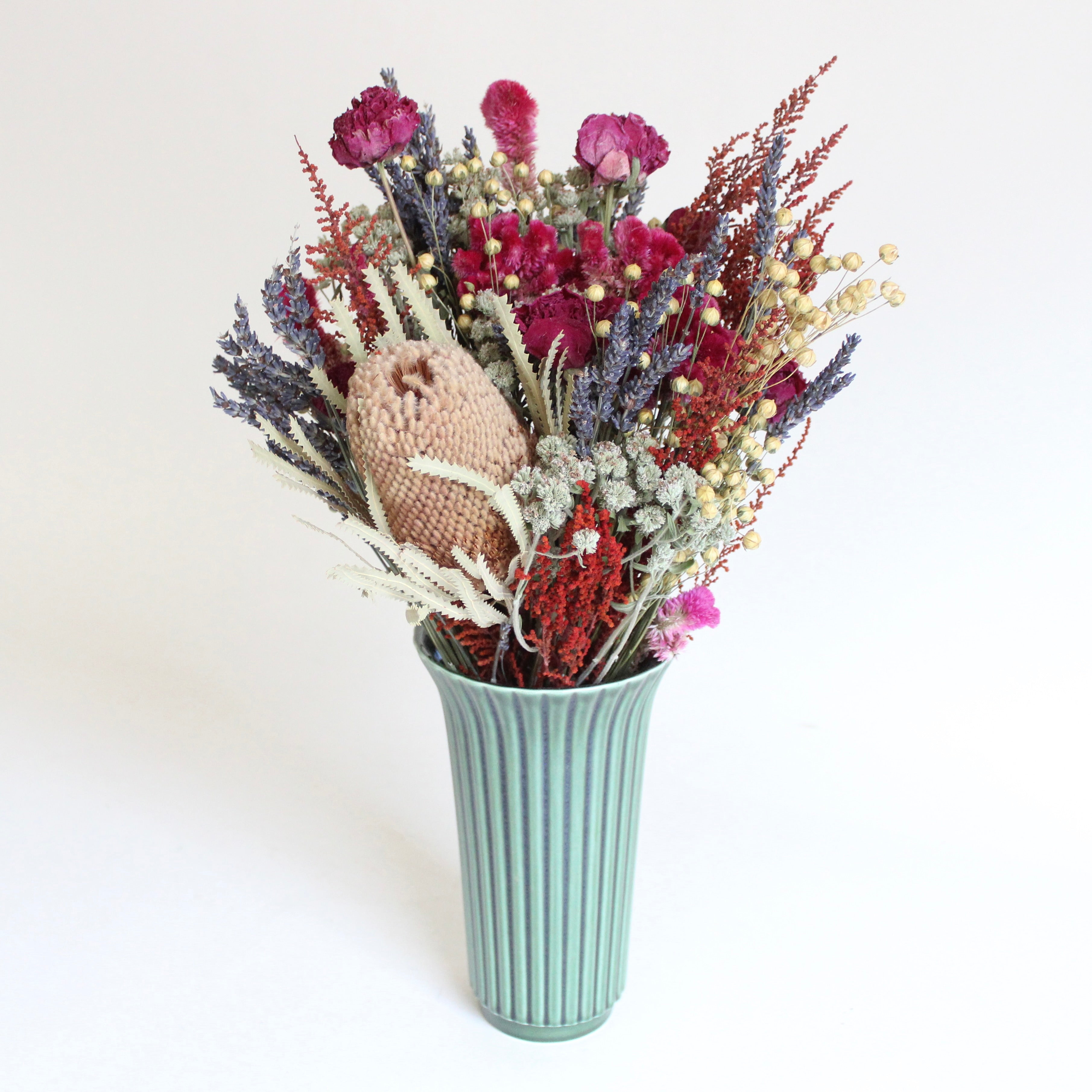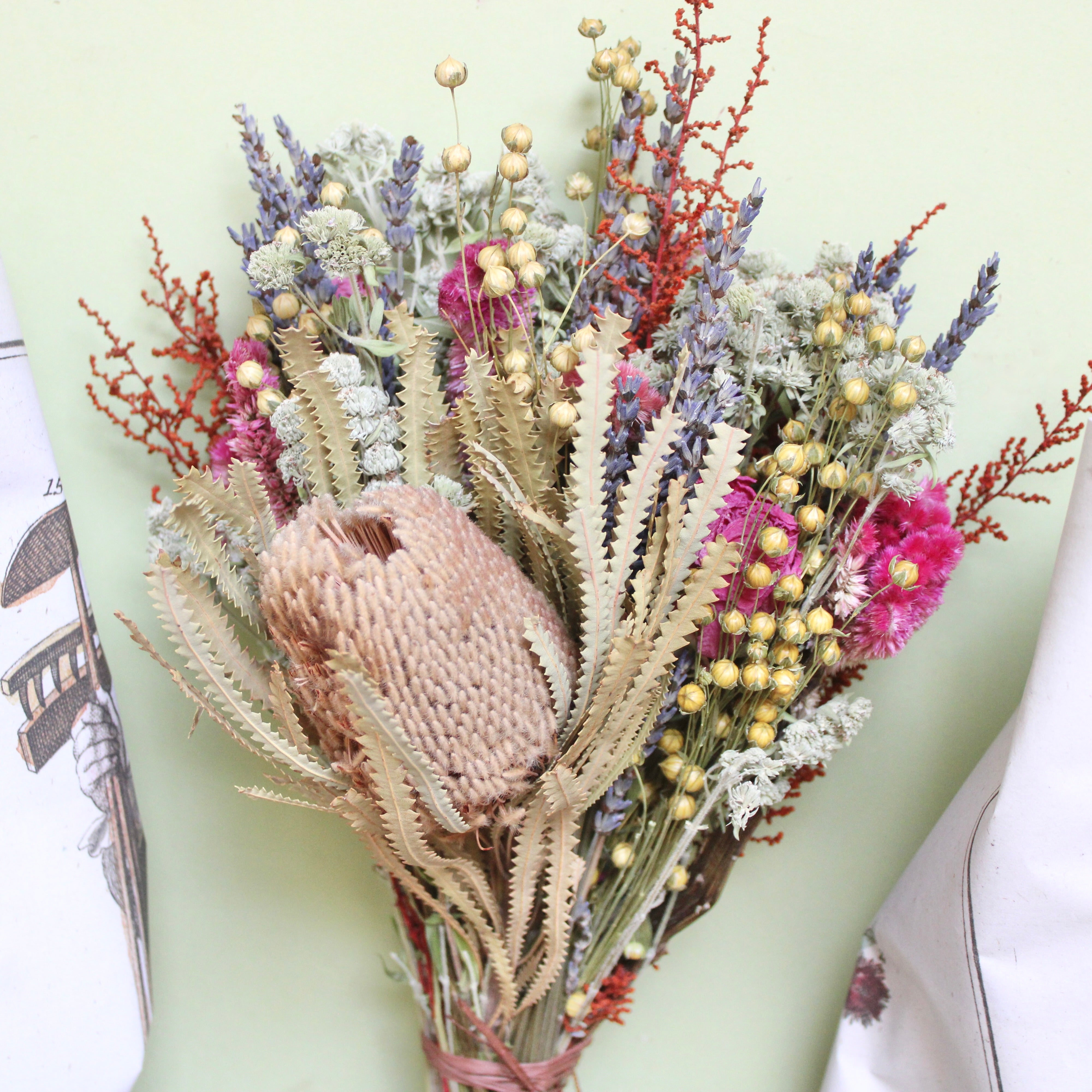Jardiniere Bouquet features banksia, cockscomb, lavender, flax, caspia, mountain mint, and peony.