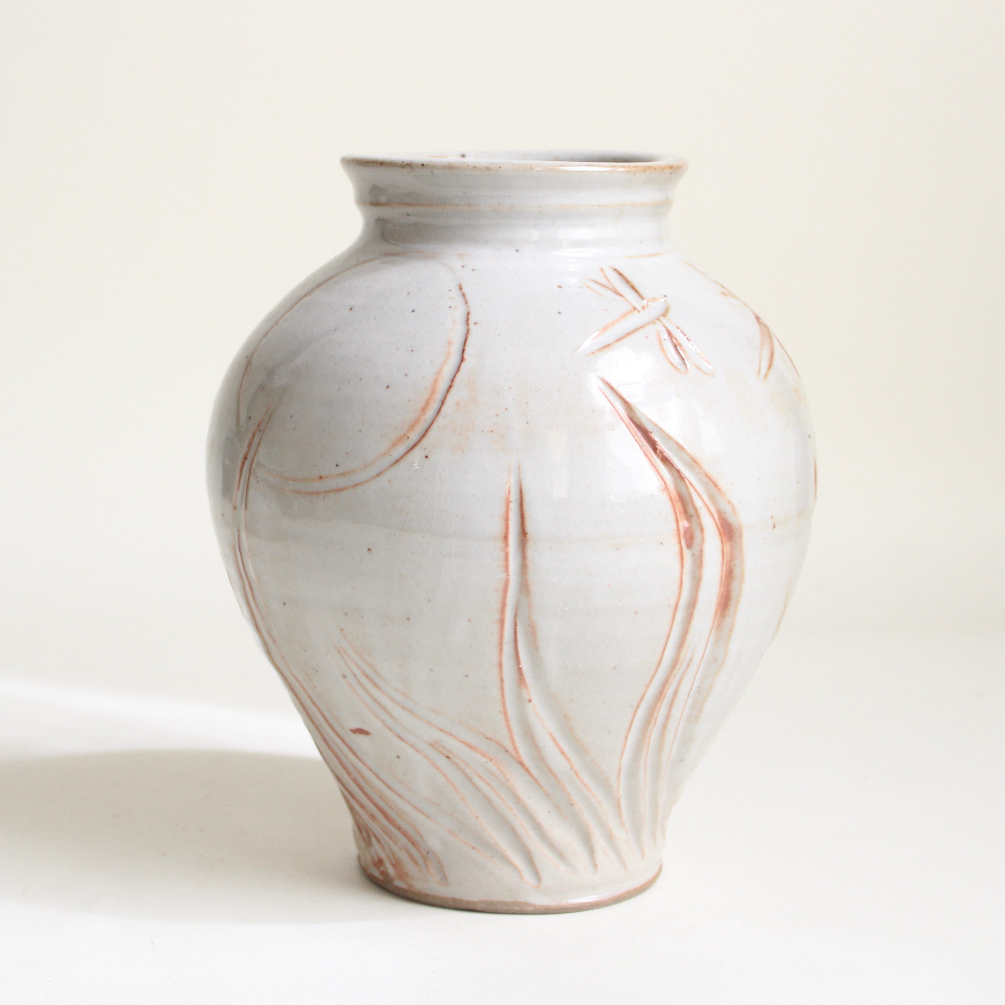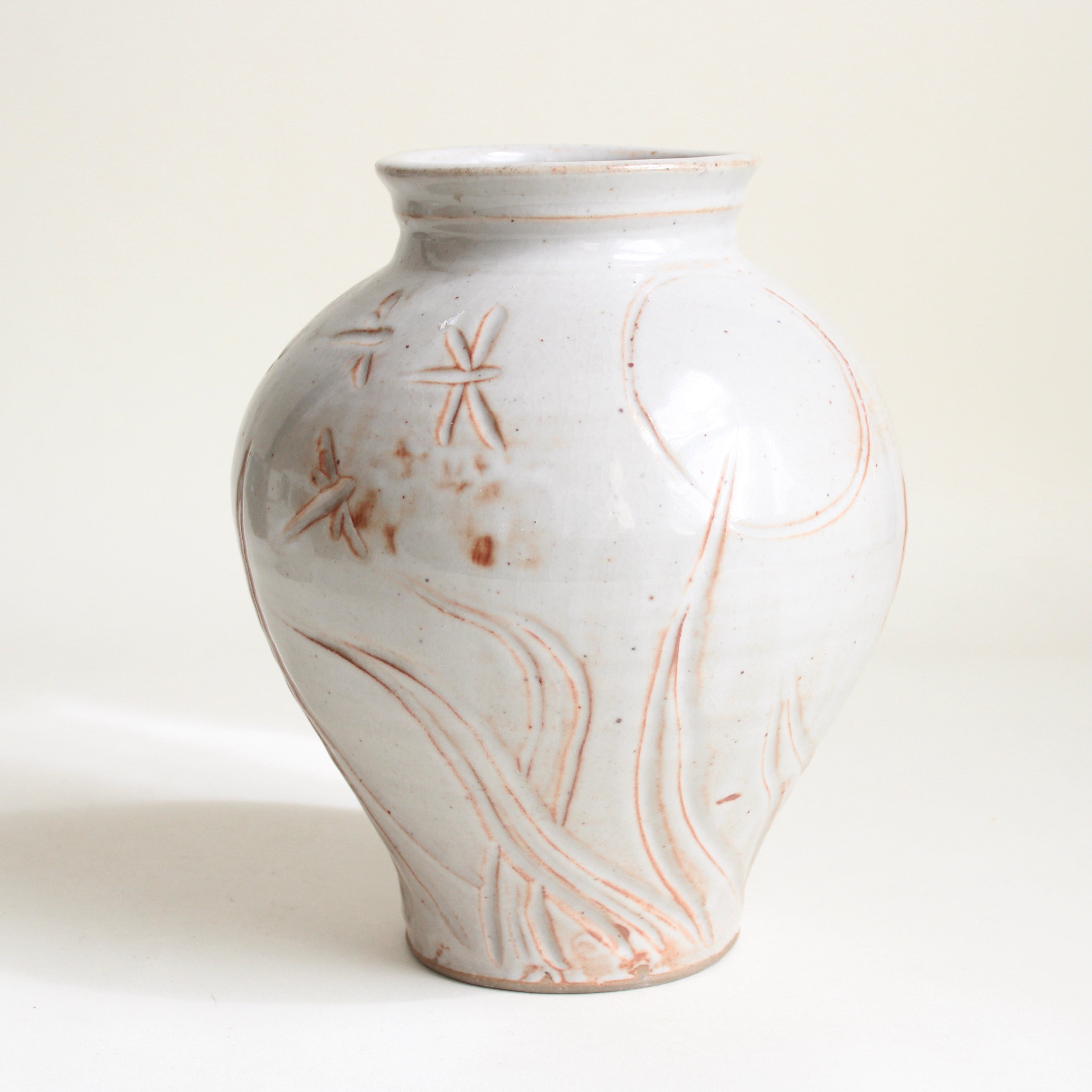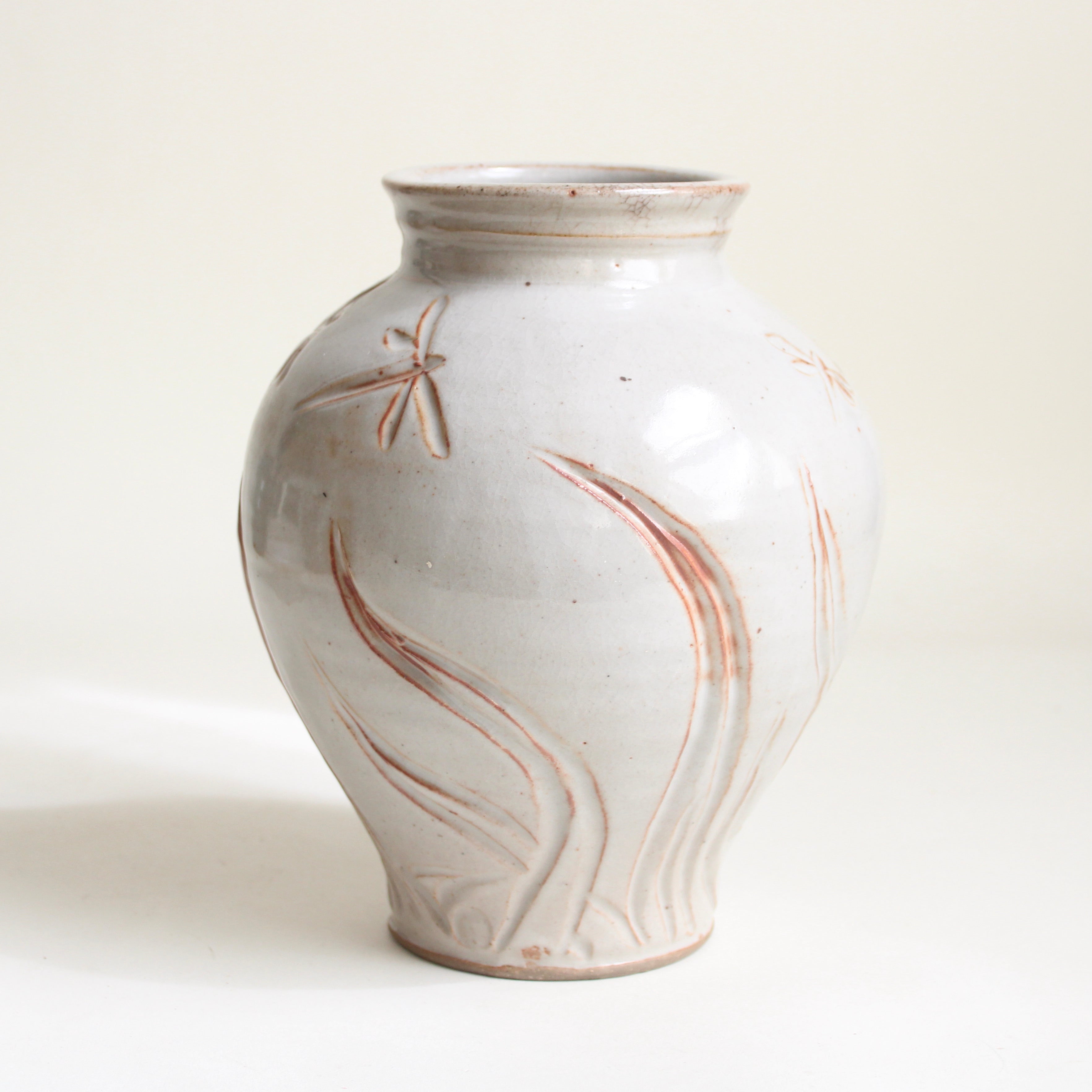 I love this jar! It’s classic shape is thrown from sturdy stoneware clay fired to white heat in a wood fired kiln. The white shino type glaze reveals the lightly carved grasses and dragonflies beneath the full moon. Truly a fine piece of handmade pottery. measures 8.75” x 4”
