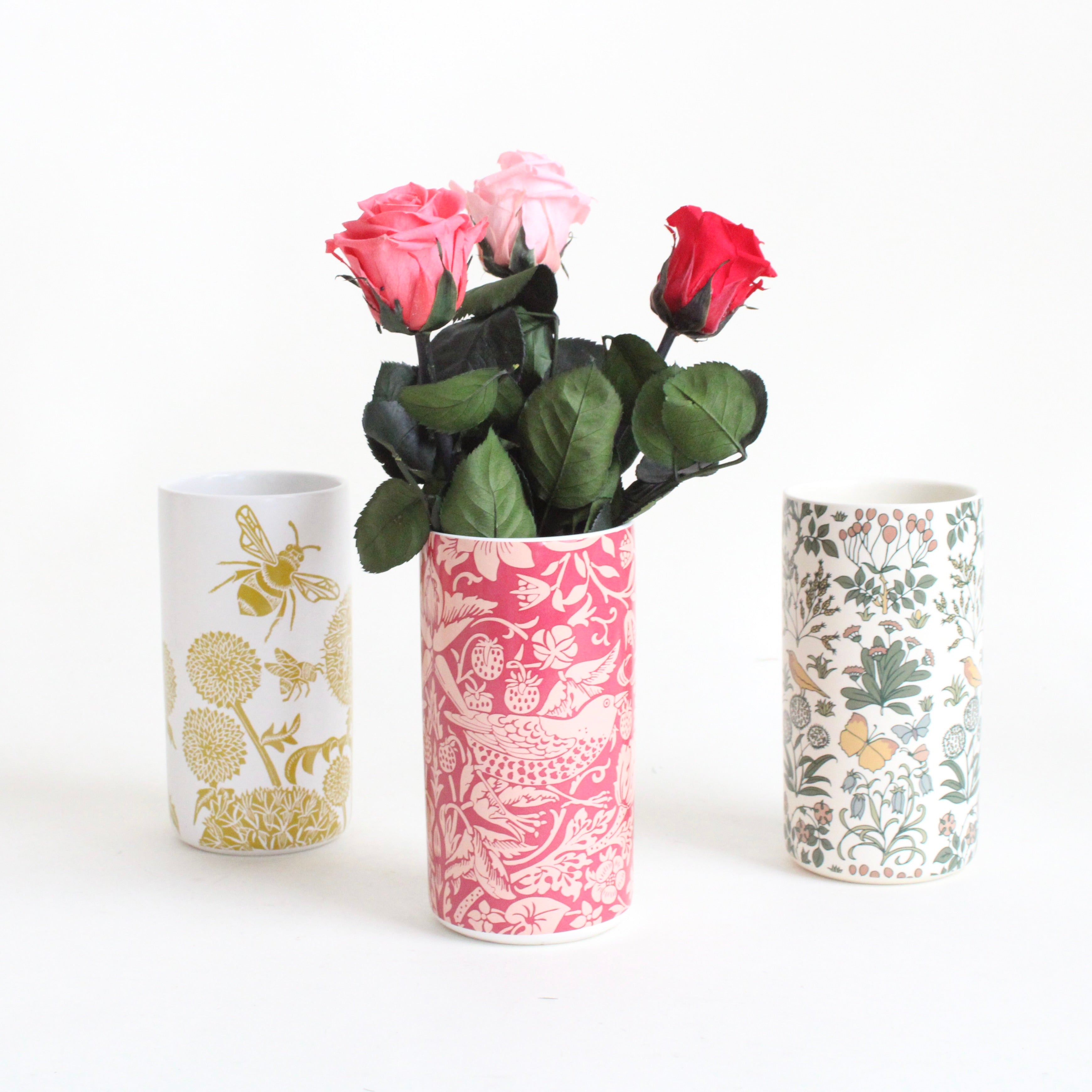 A simple cylinder adorned with a William Morris pattern in a rich raspberry hue, made to hold your next fresh or dried arrangement. It adds a welcome pop of color to a vase collection, an eclectic bookshelf, or a bedside table.