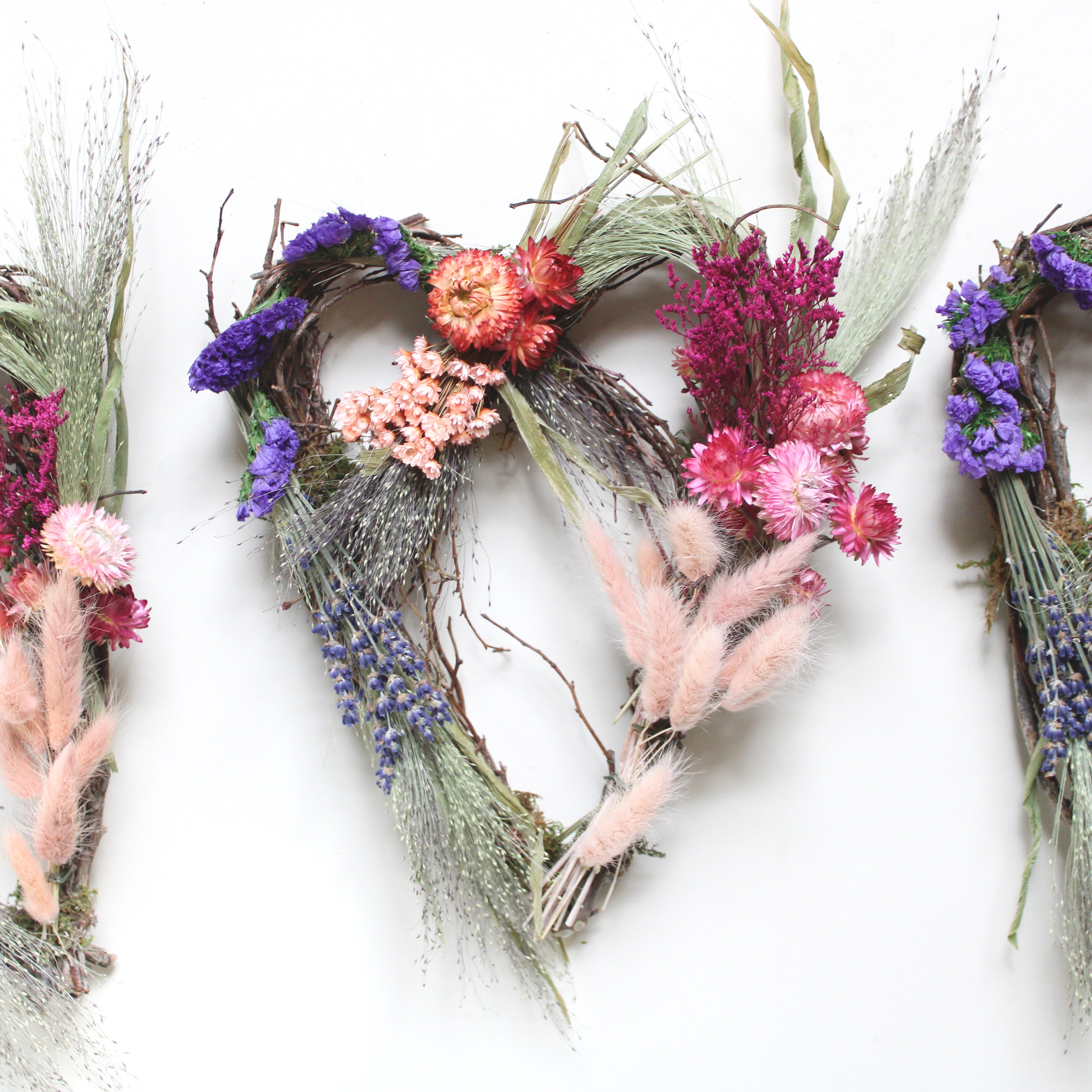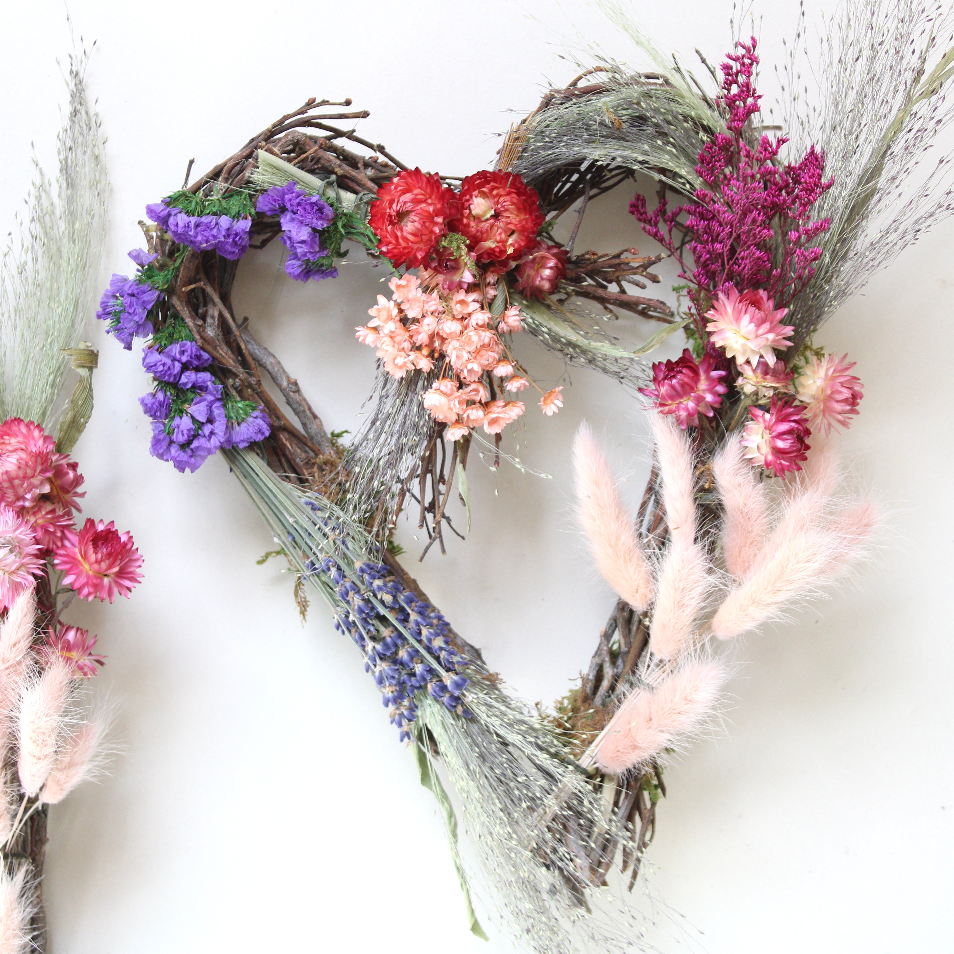 Cottage Heart Wreath features lavender, strawflower, star flower, bunny tail, caspia, sinuata statice, and explosion grass.