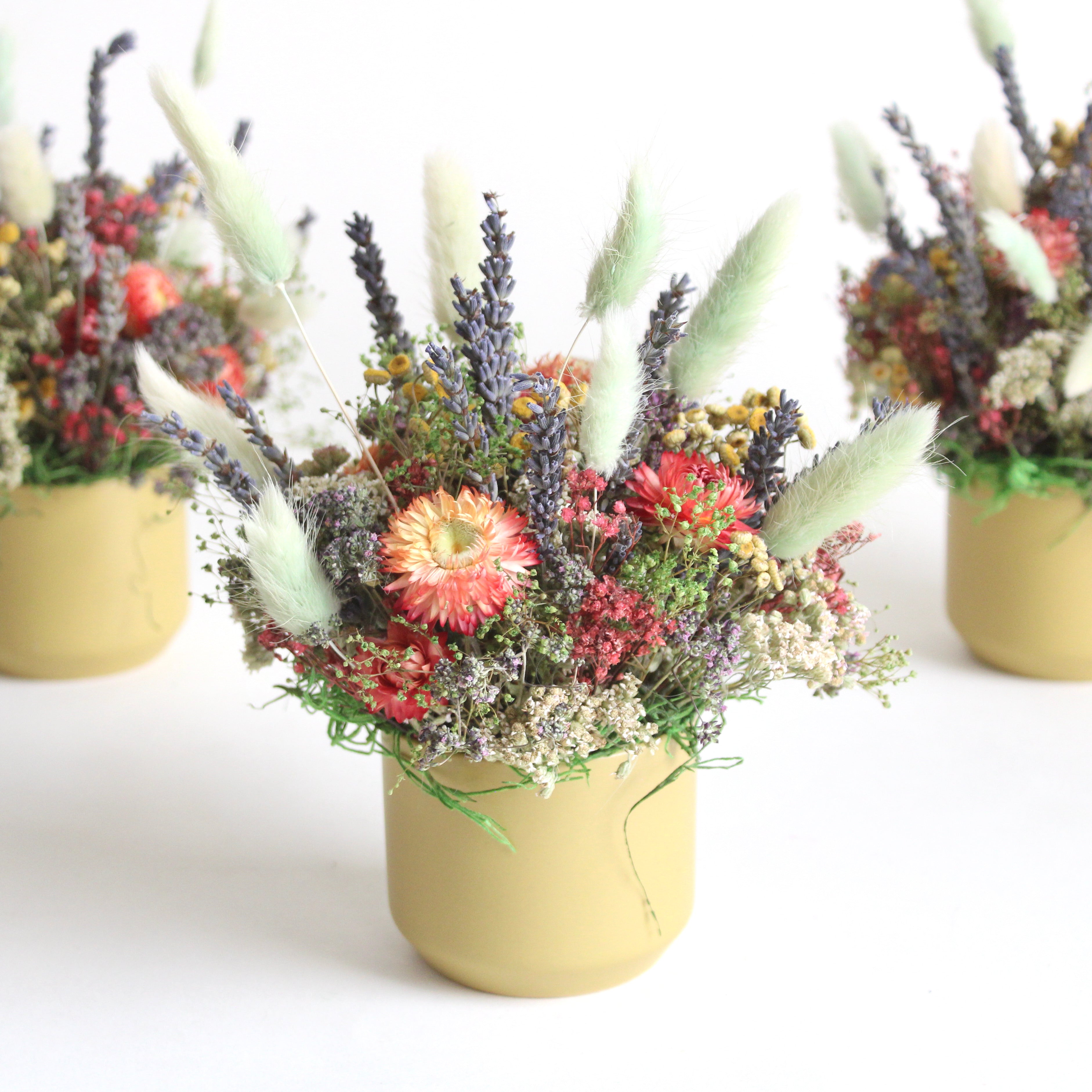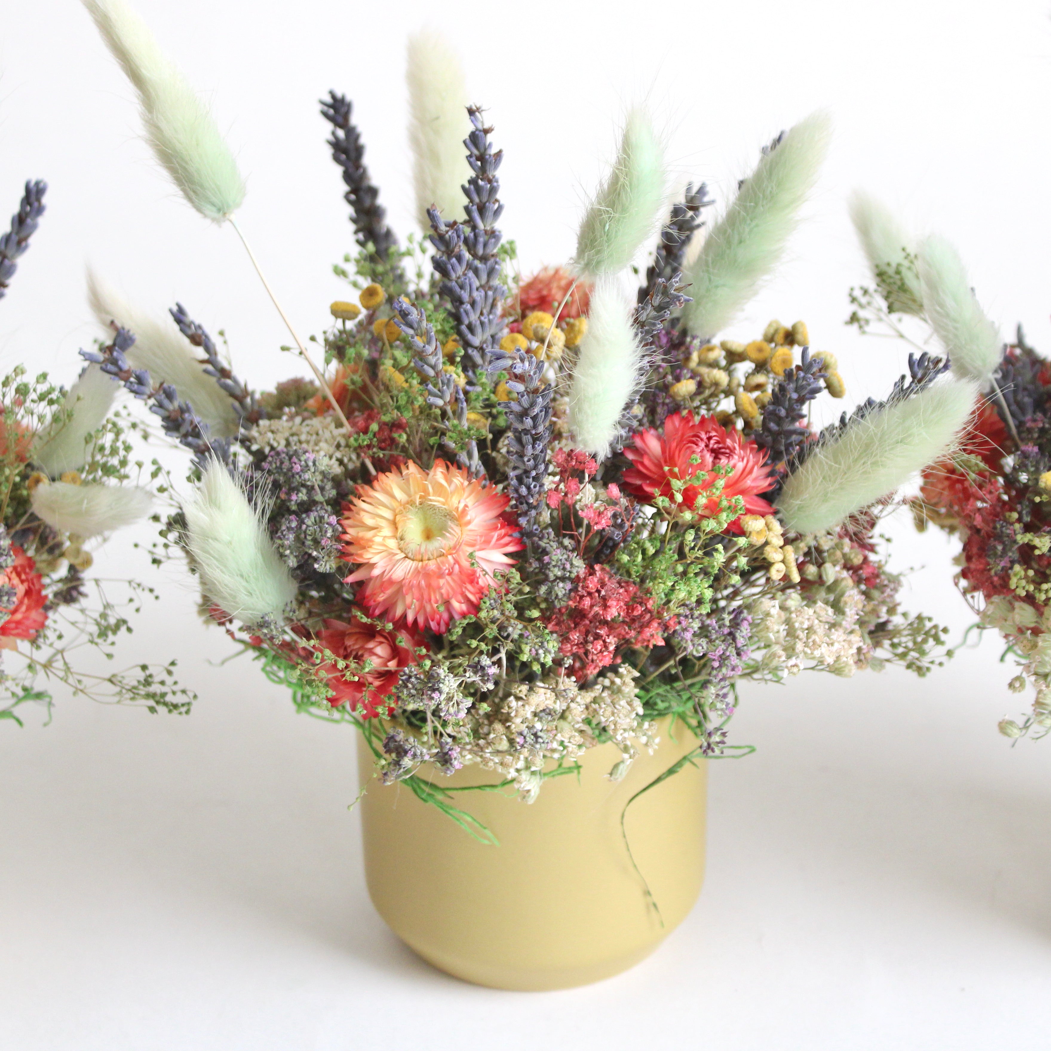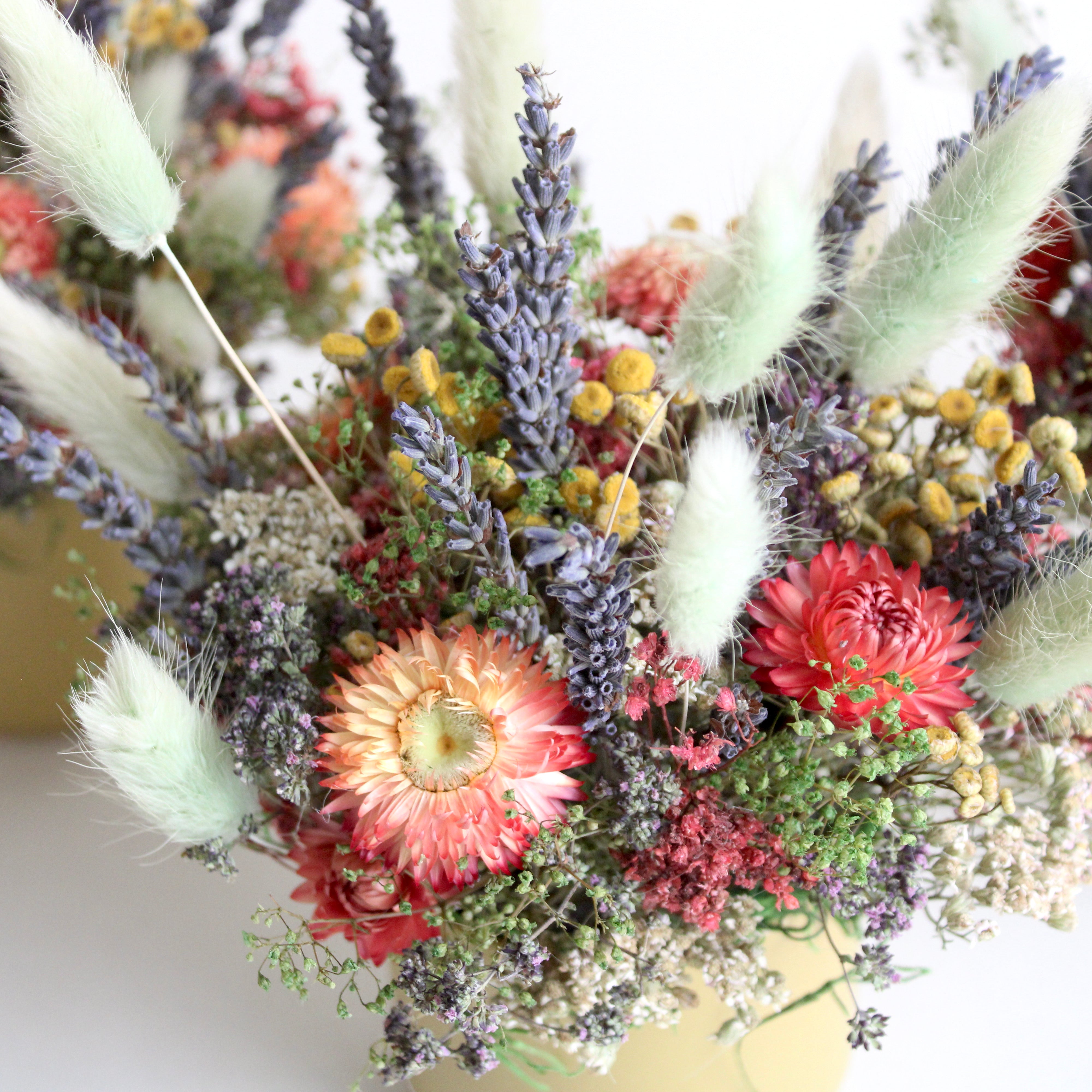 Dried and preserved flowers are mostly care free. The main factors that effect them are light or humidity. Direct sunlight can cause flowers to fade, and moisture can be absorbed and make certain flowers "wilt". If they end up getting dusty, we recommend canned air or a blow dryer on a low cool setting.