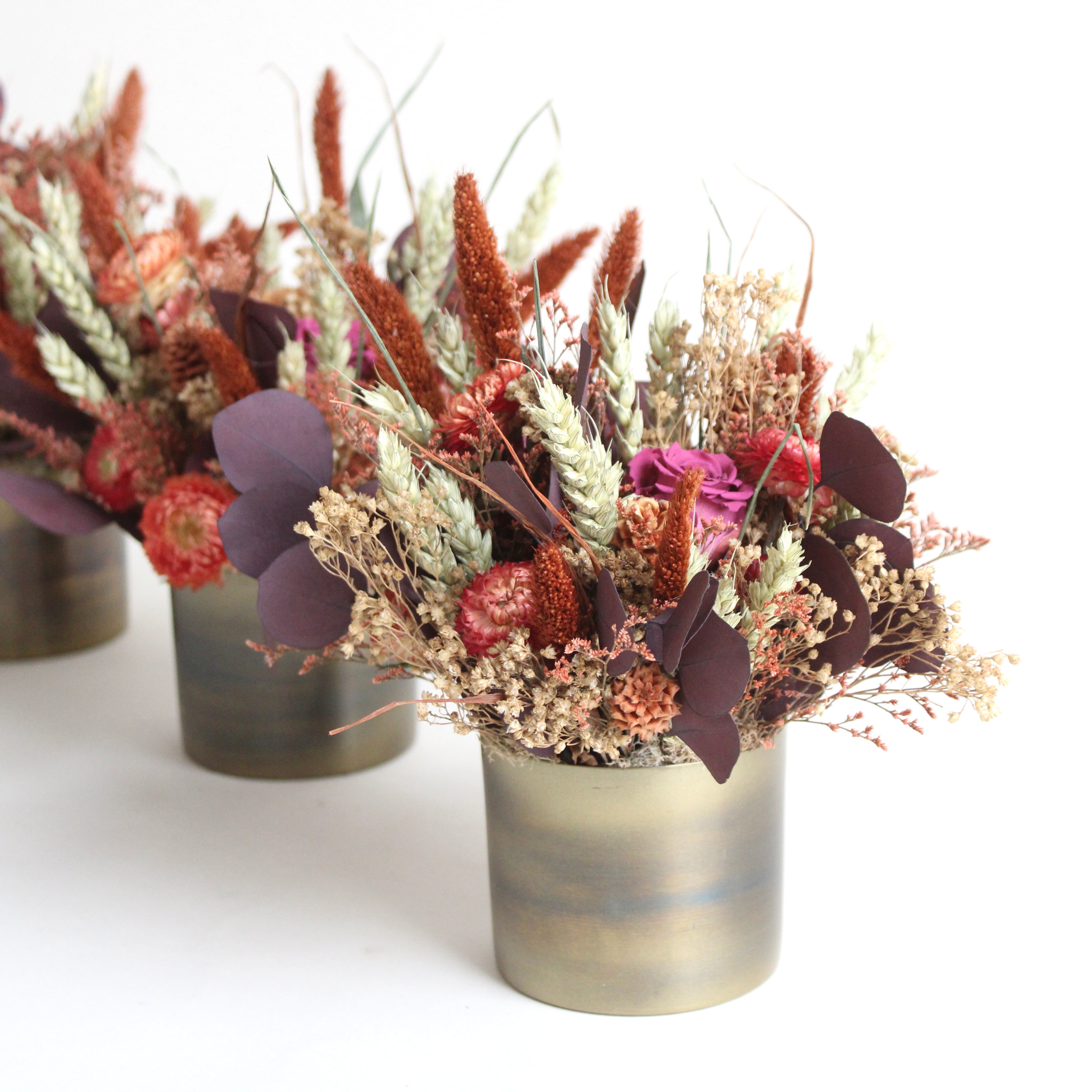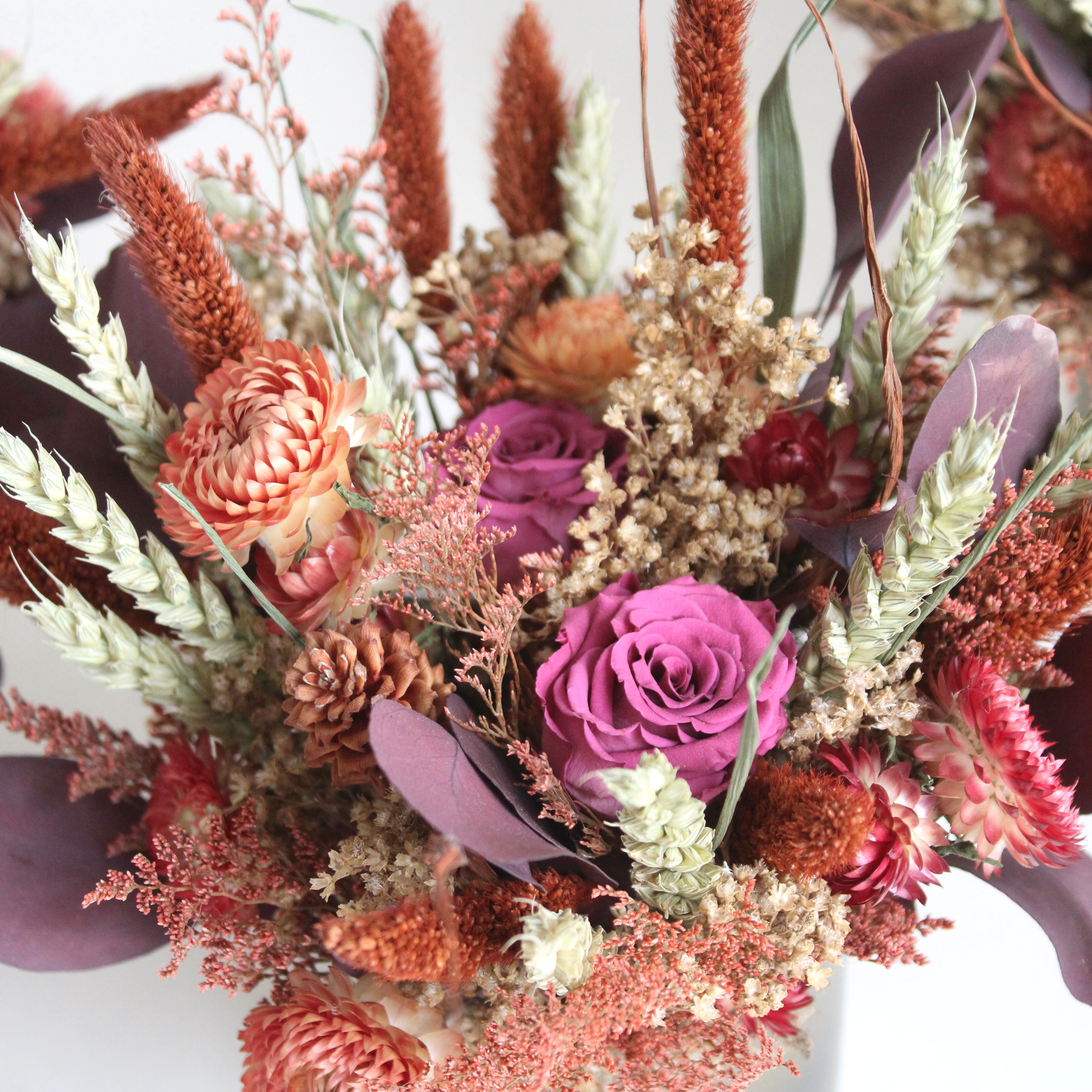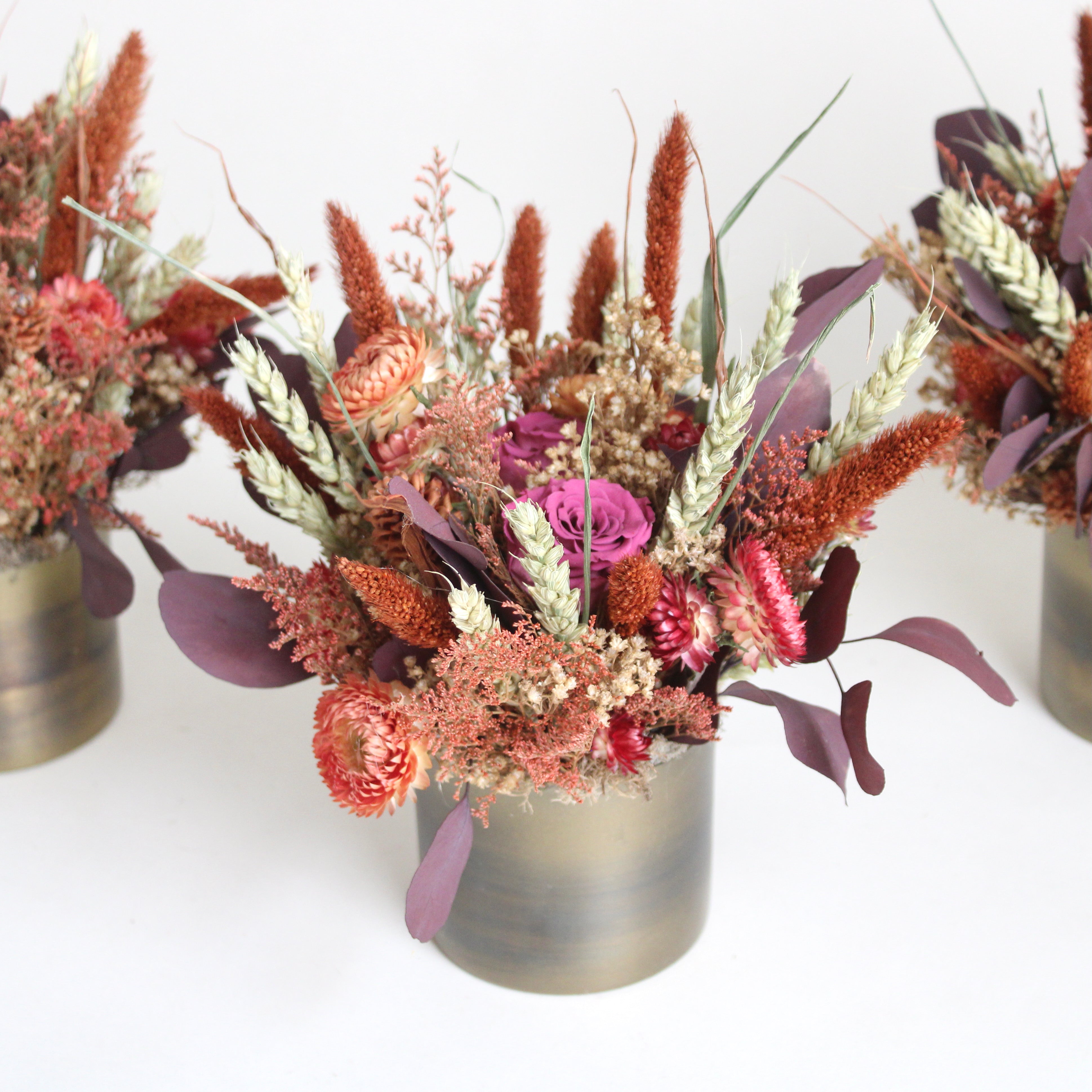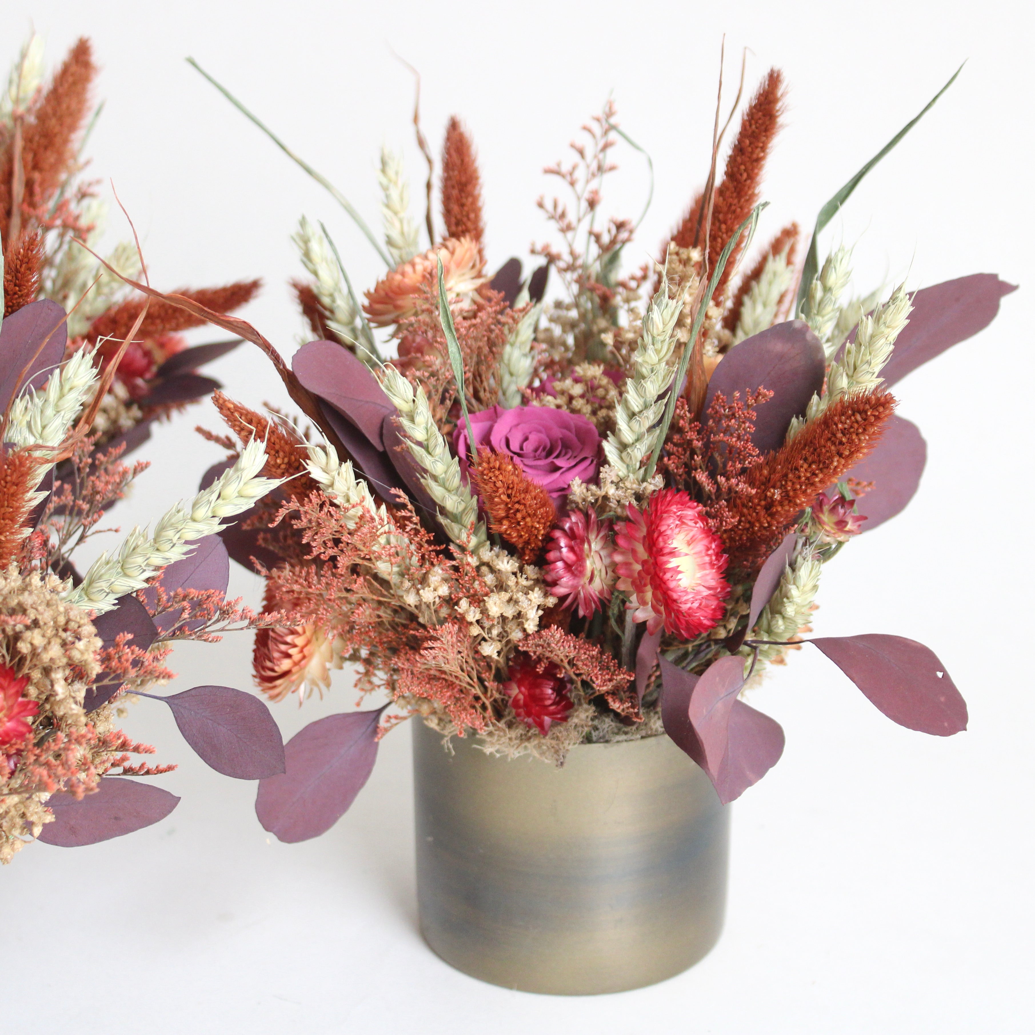 Bronze & Copper Cup features strawflower, eucalyptus, setaria, avena, caspia, broom bloom, and preserved roses.