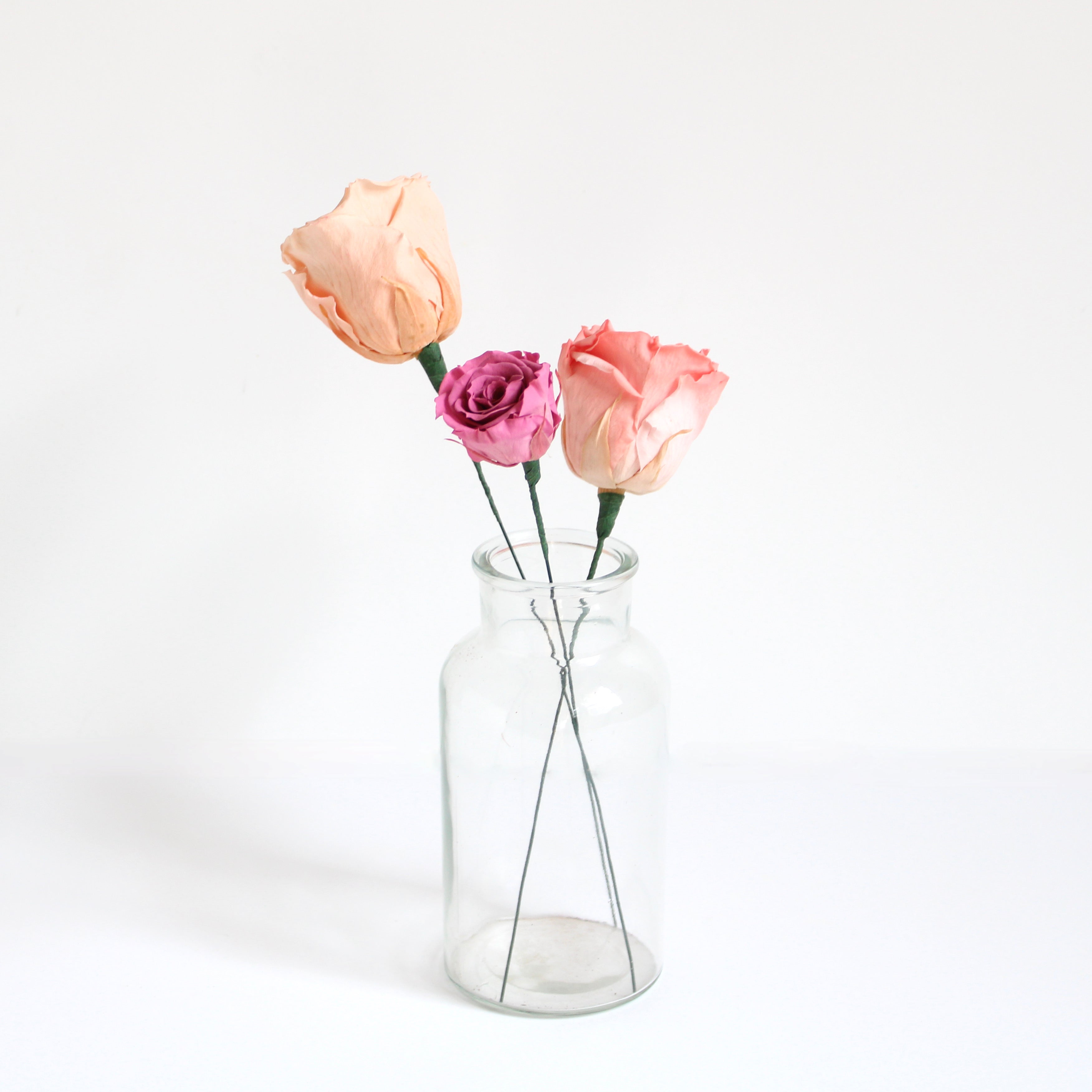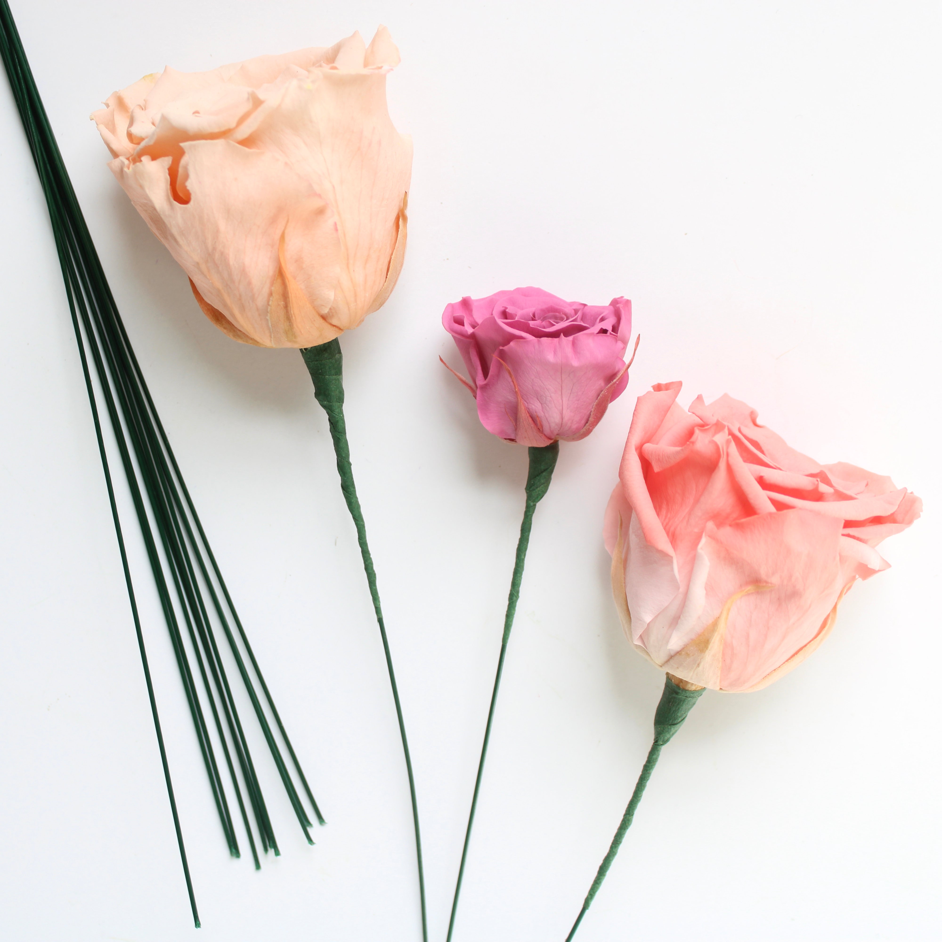 Create, elongate, and support weak stems with cut stemming wire. Attach with the added help of floral tape for wire to act as a stem for arranging ease.