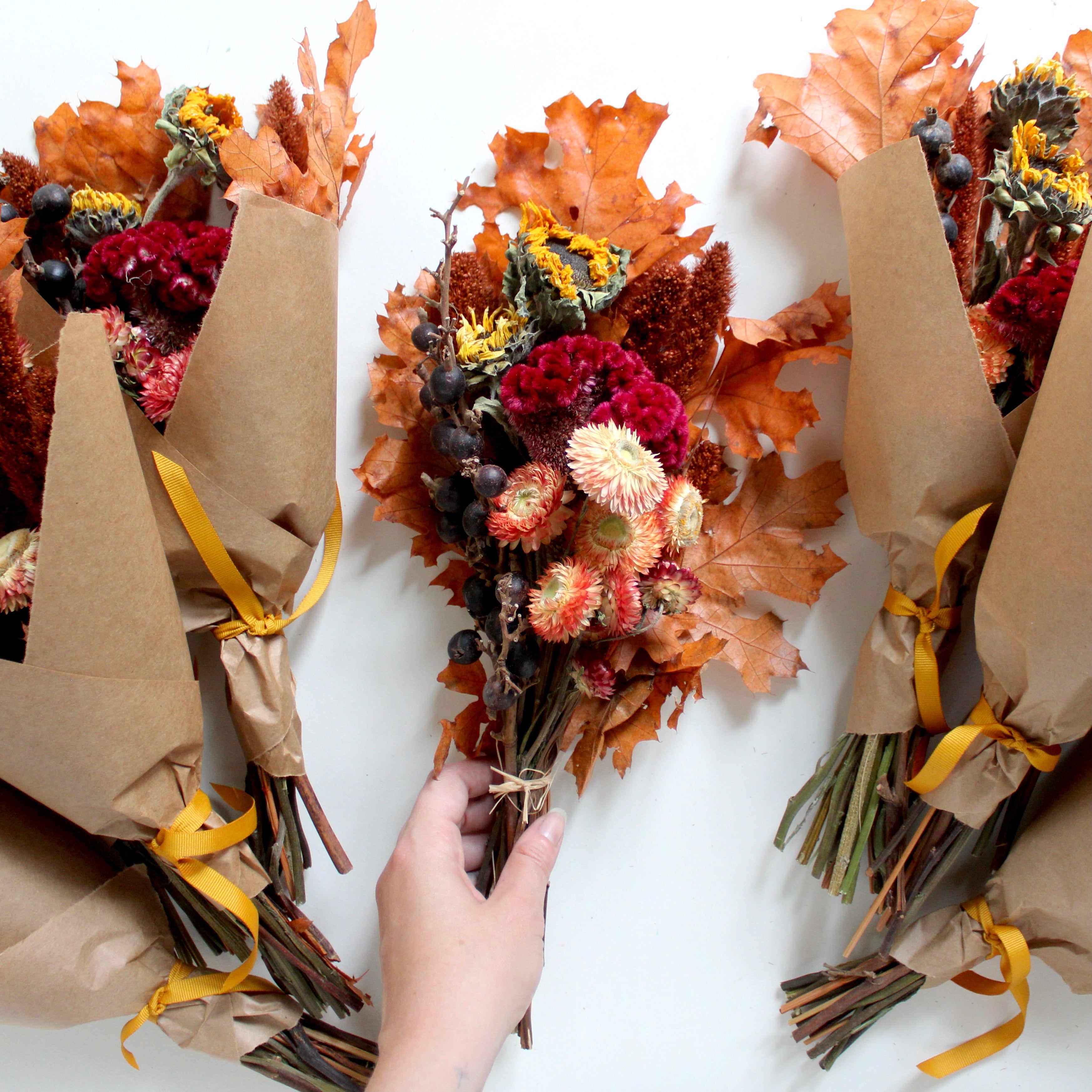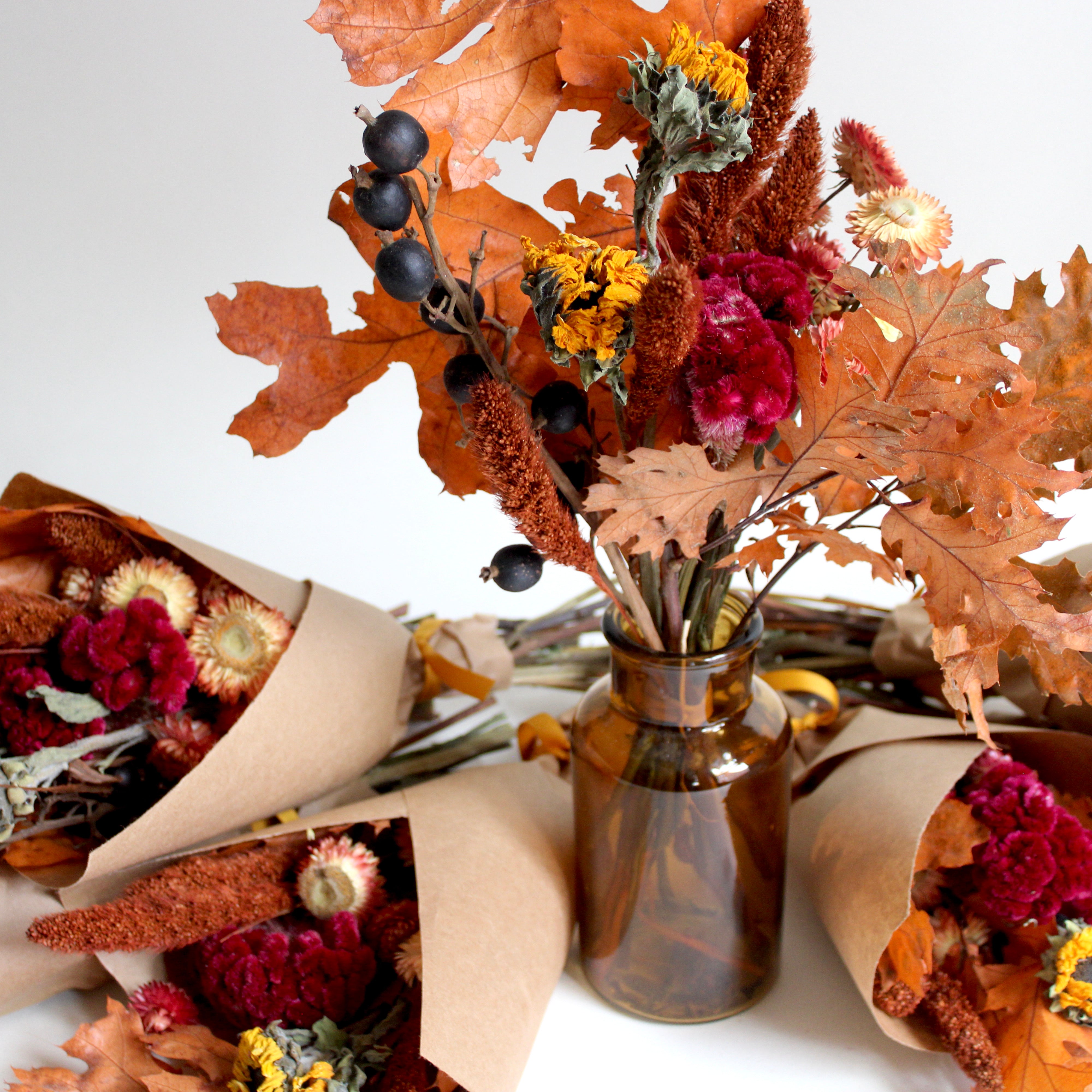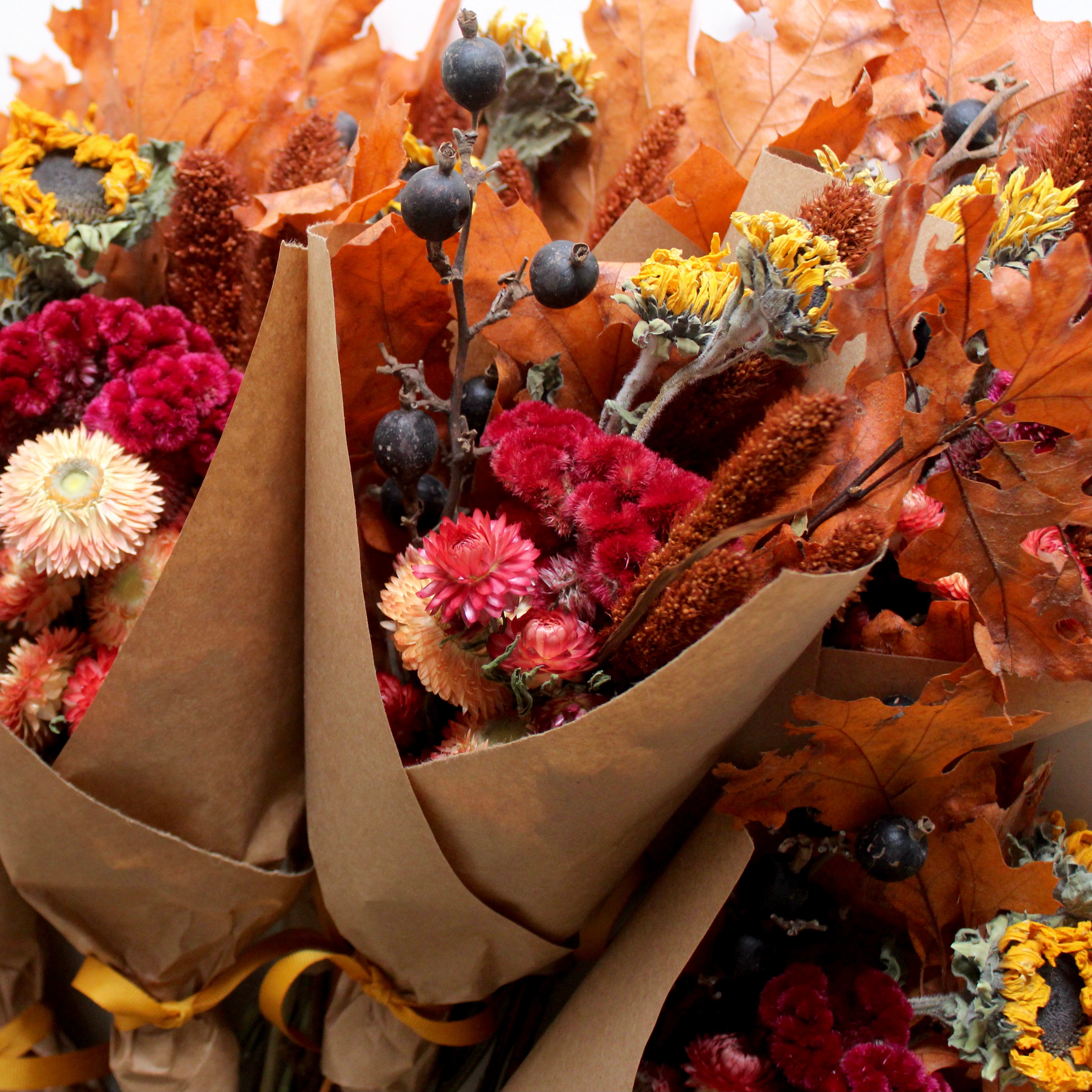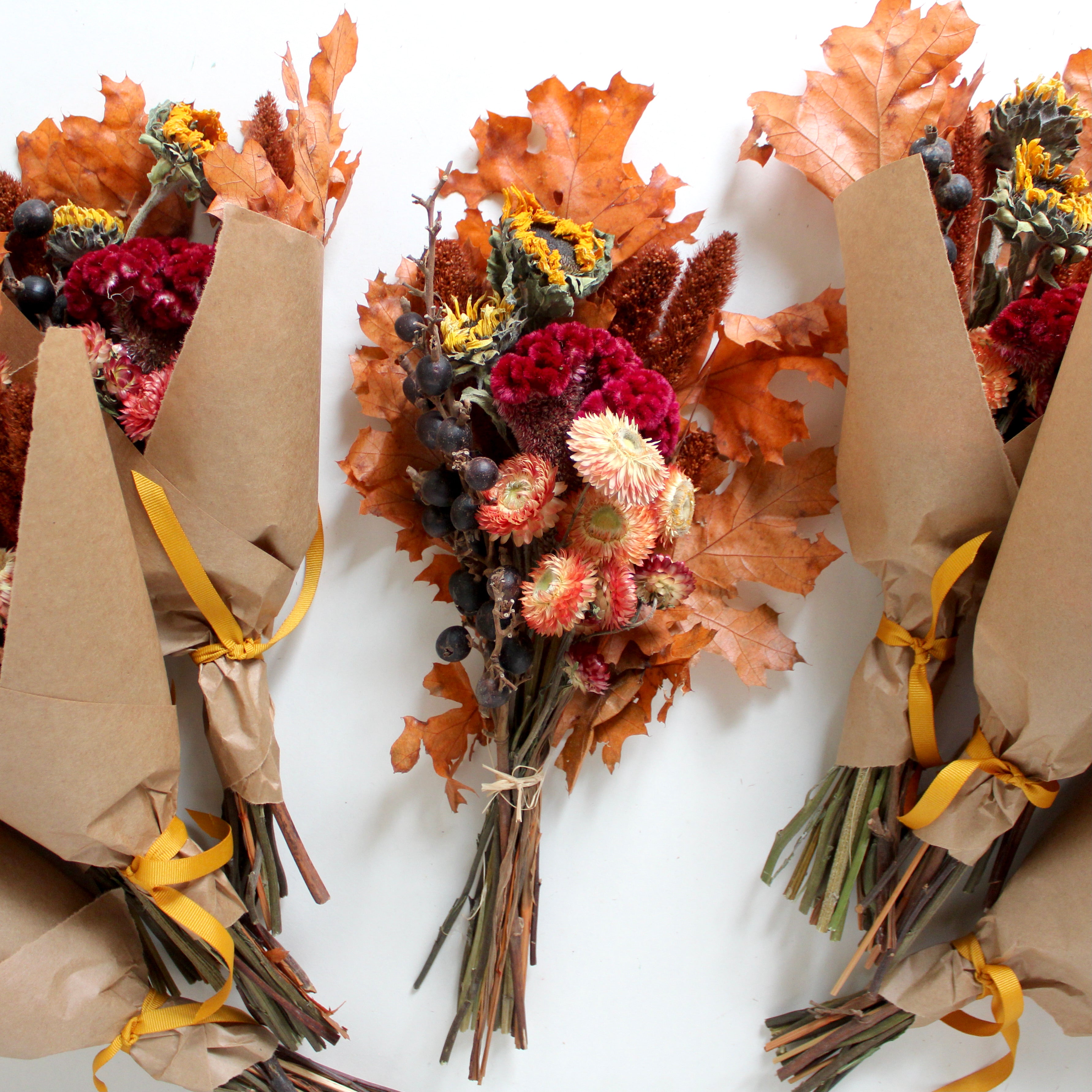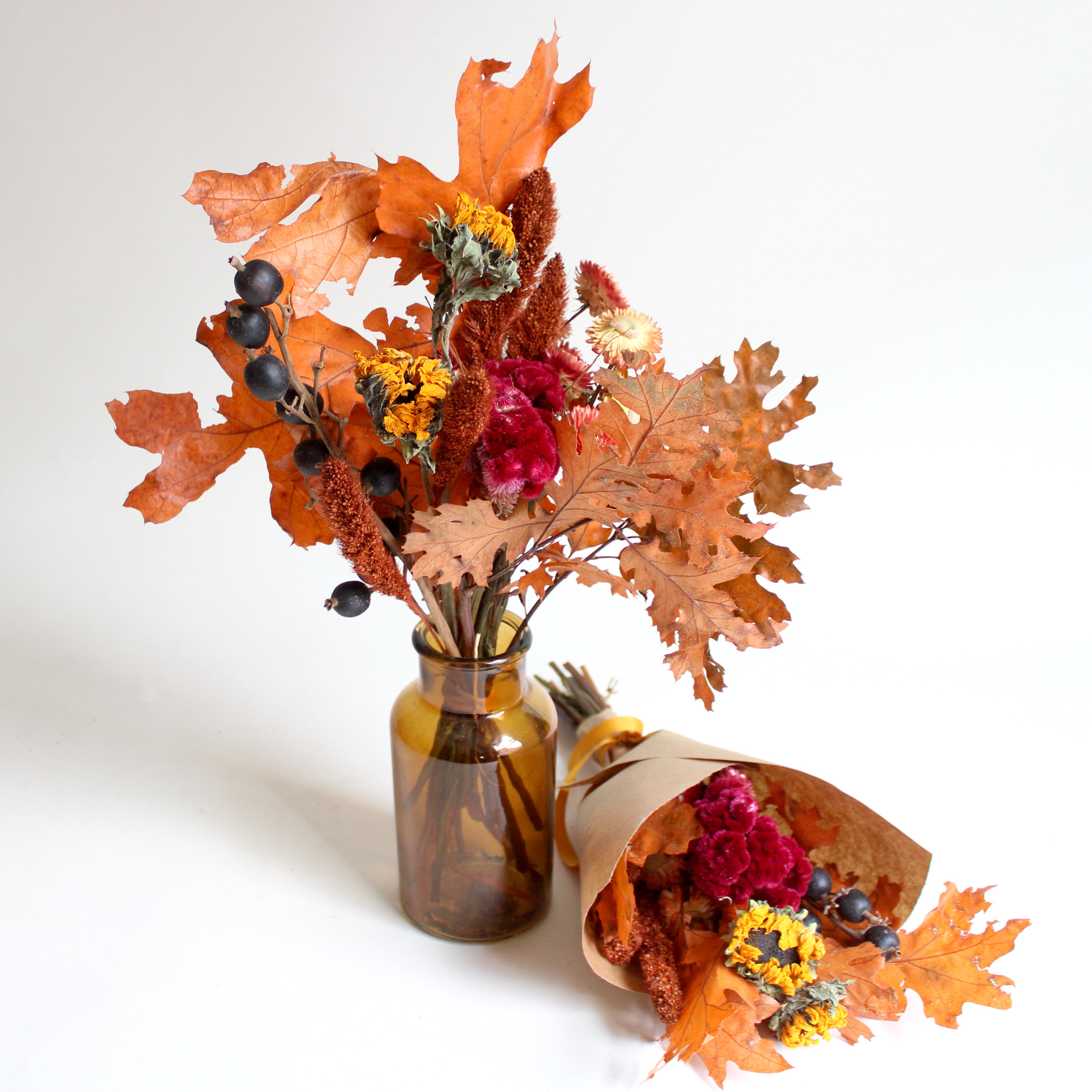Fall Frolic Bouquet features sunflower, strawflower, setaria, oak leaves, cockscomb ,and black berry clusters.