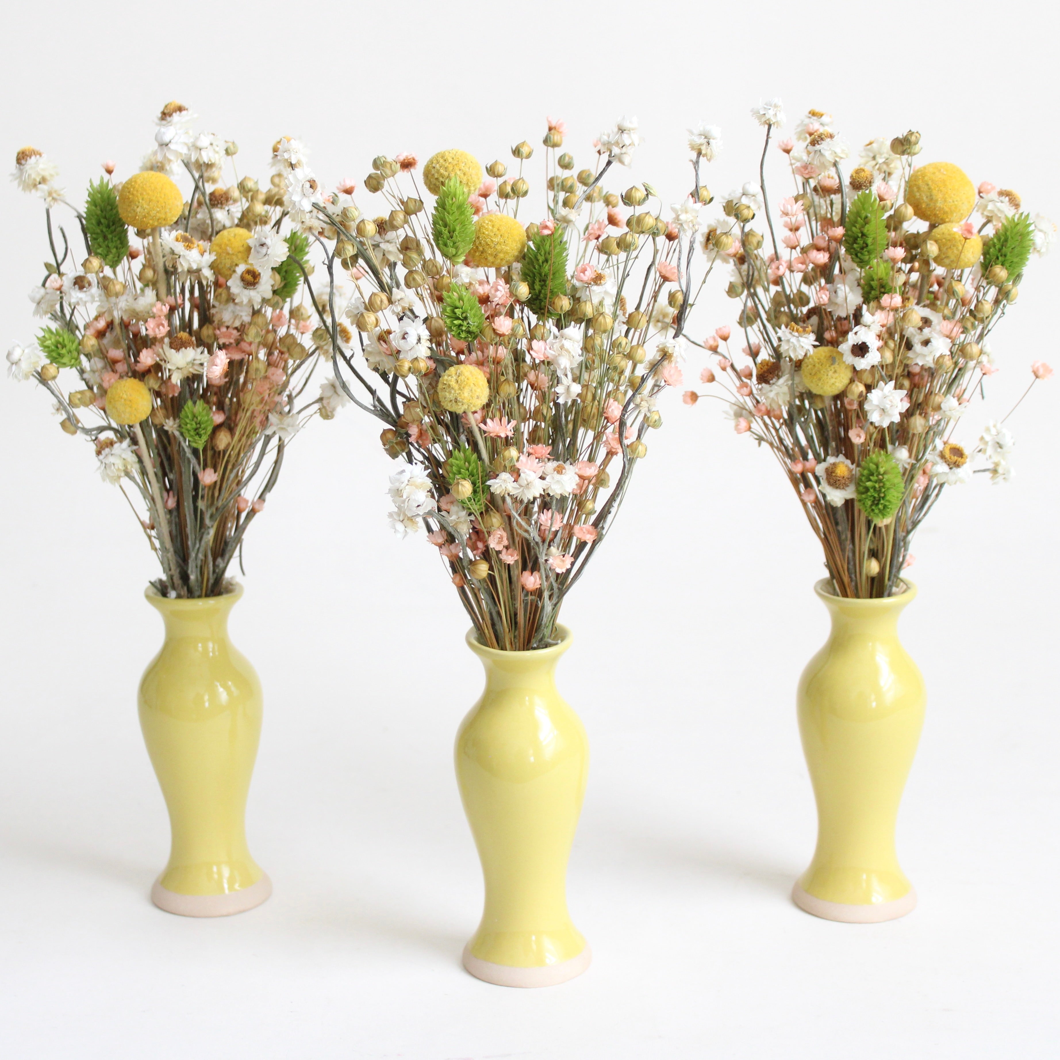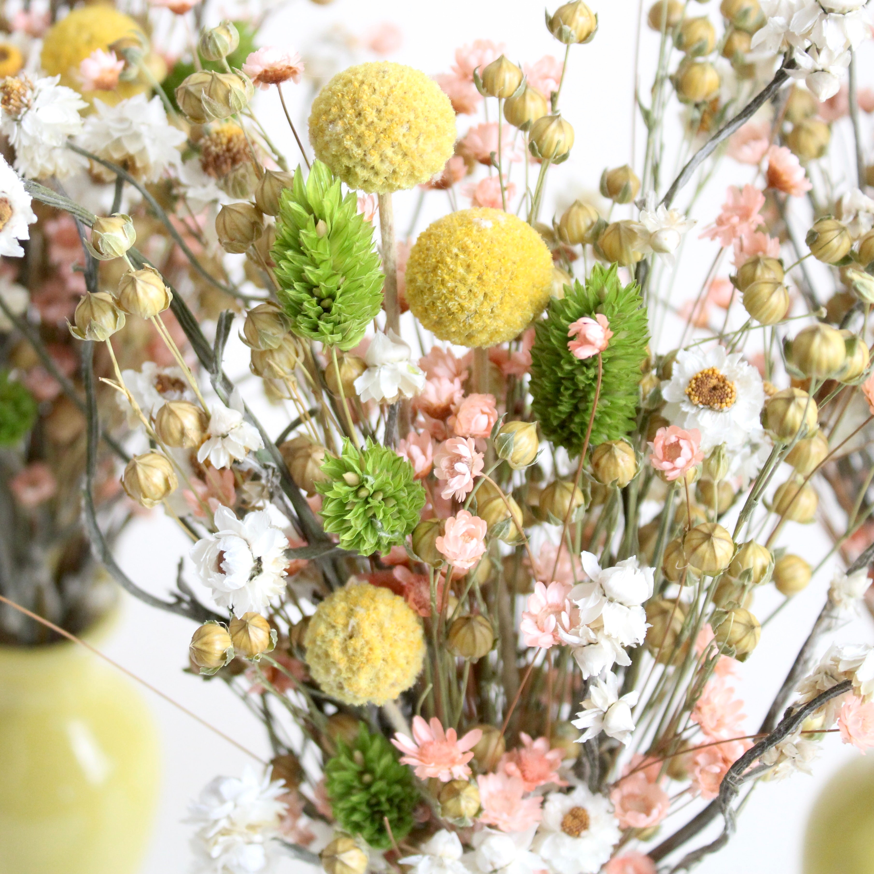 Flaxen Meadows Arrangement features flax, starflower, ammobium, phalaris, and craspedia.