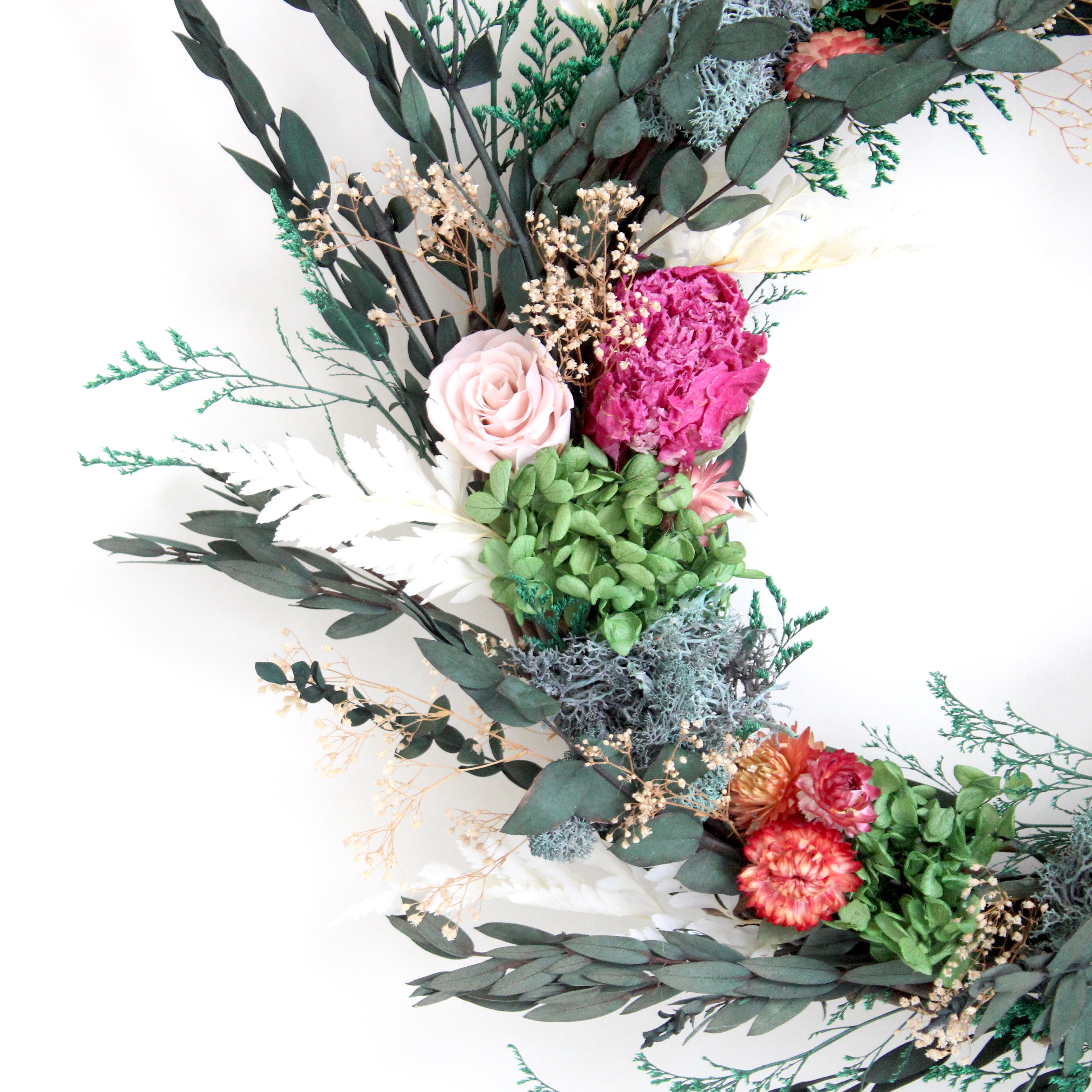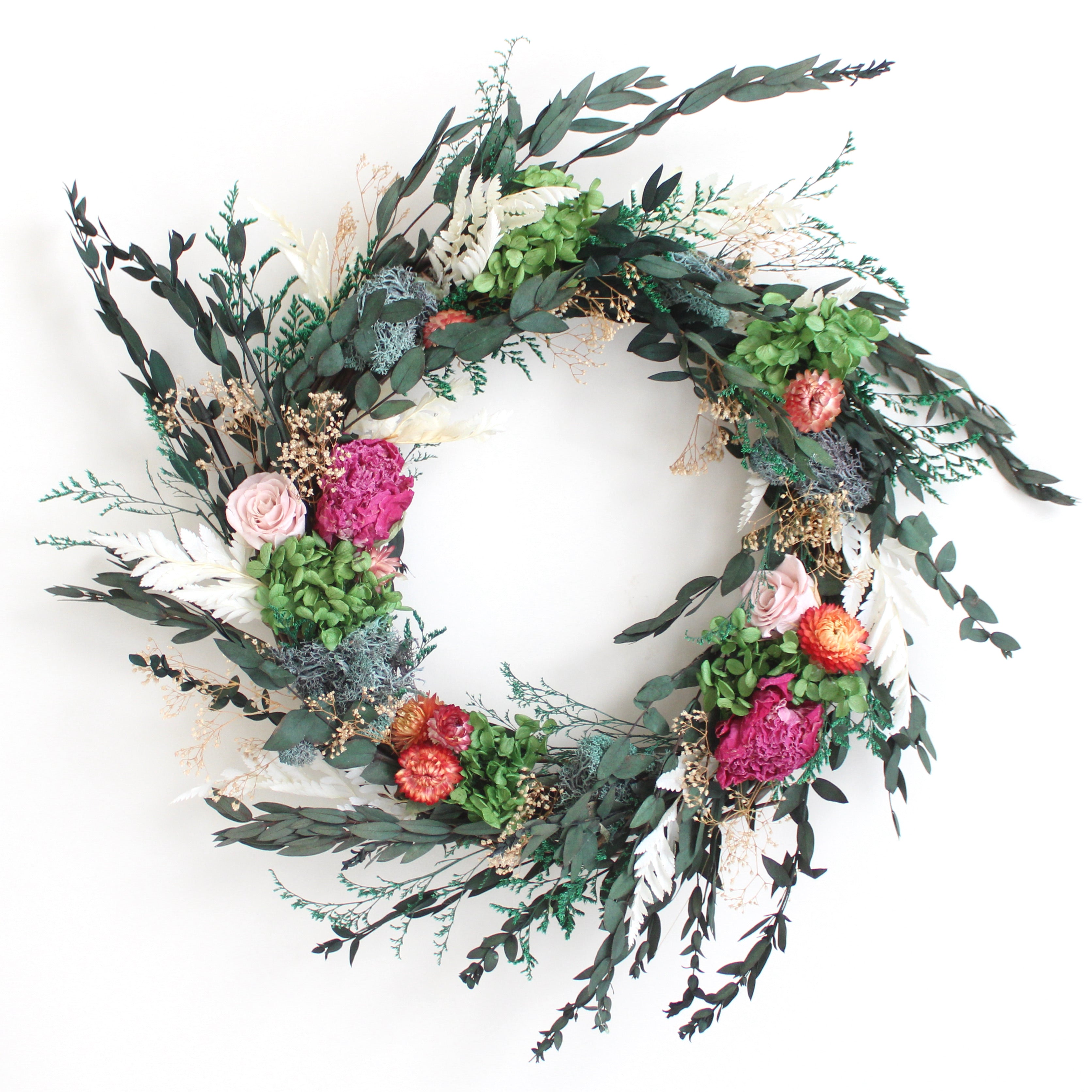 Flower Frolic Wreath features eucalyptus, peony, fern, broom bloom, strawflower, moss, hydrangea, caspia, and rose.