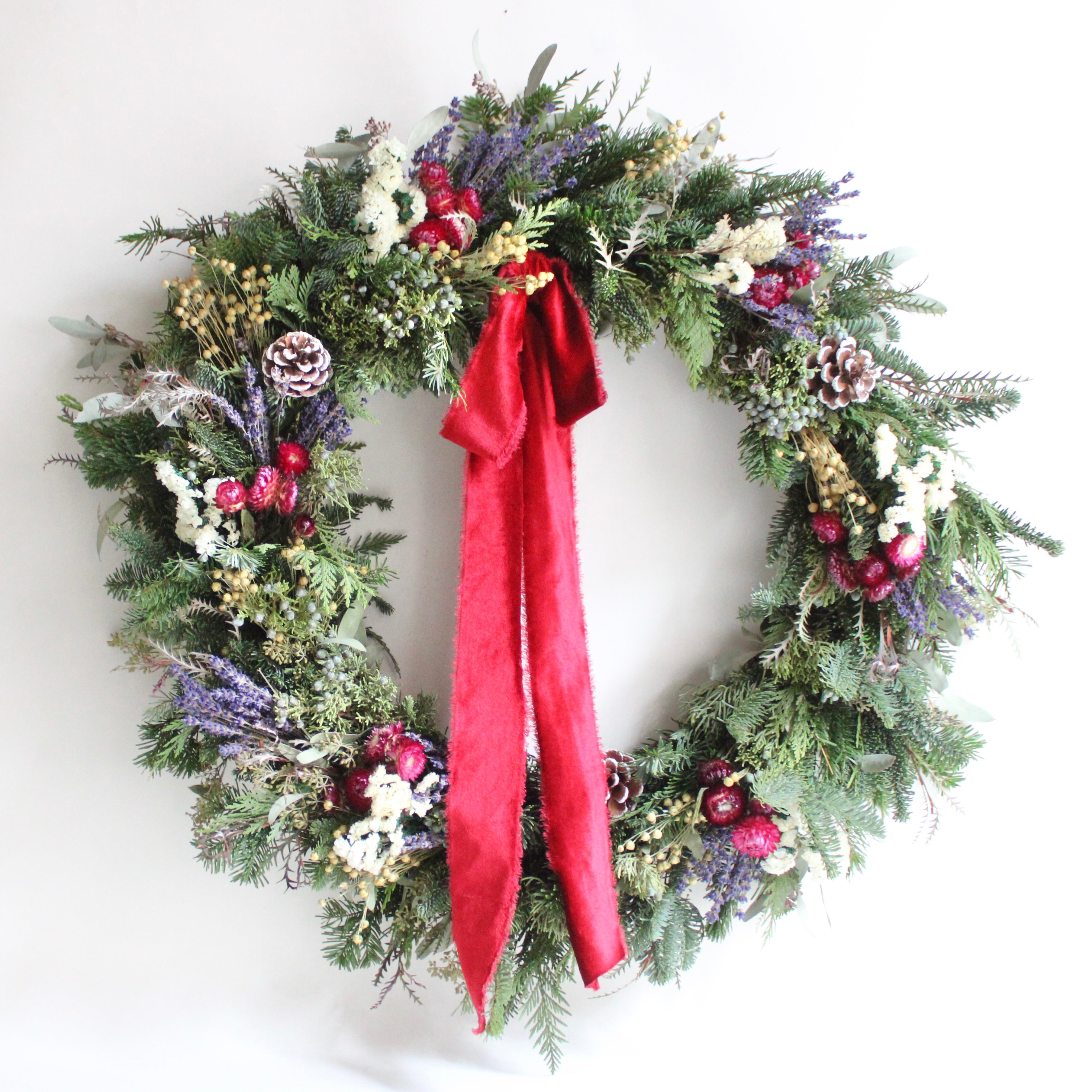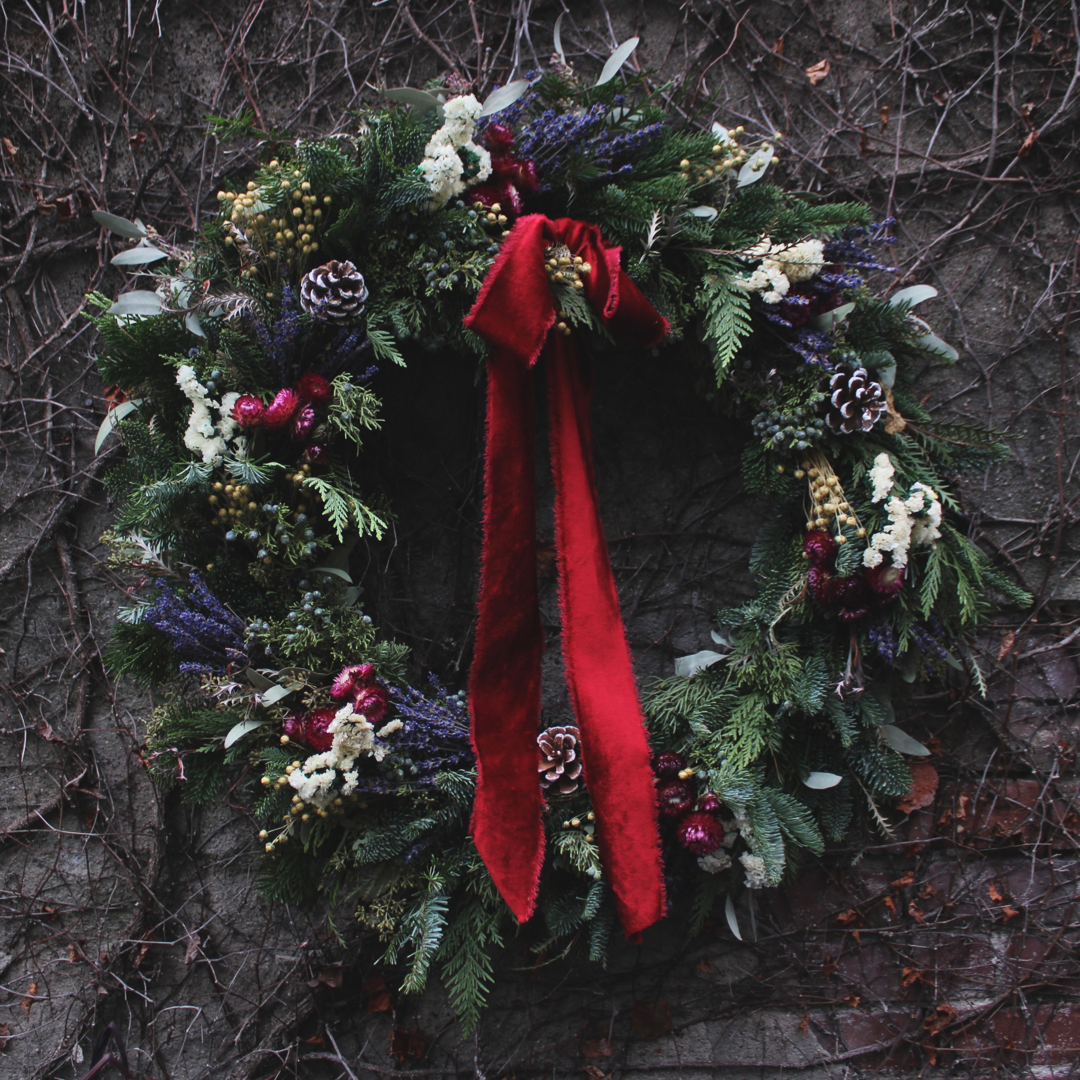 Spruce up your holiday decorating with a fresh evergreen wreath! A fragrant gathering of cedar and pine makes for a stunning base for festive fruits, pods, and ribbon. We love fresh wreaths this time of year and you will too.