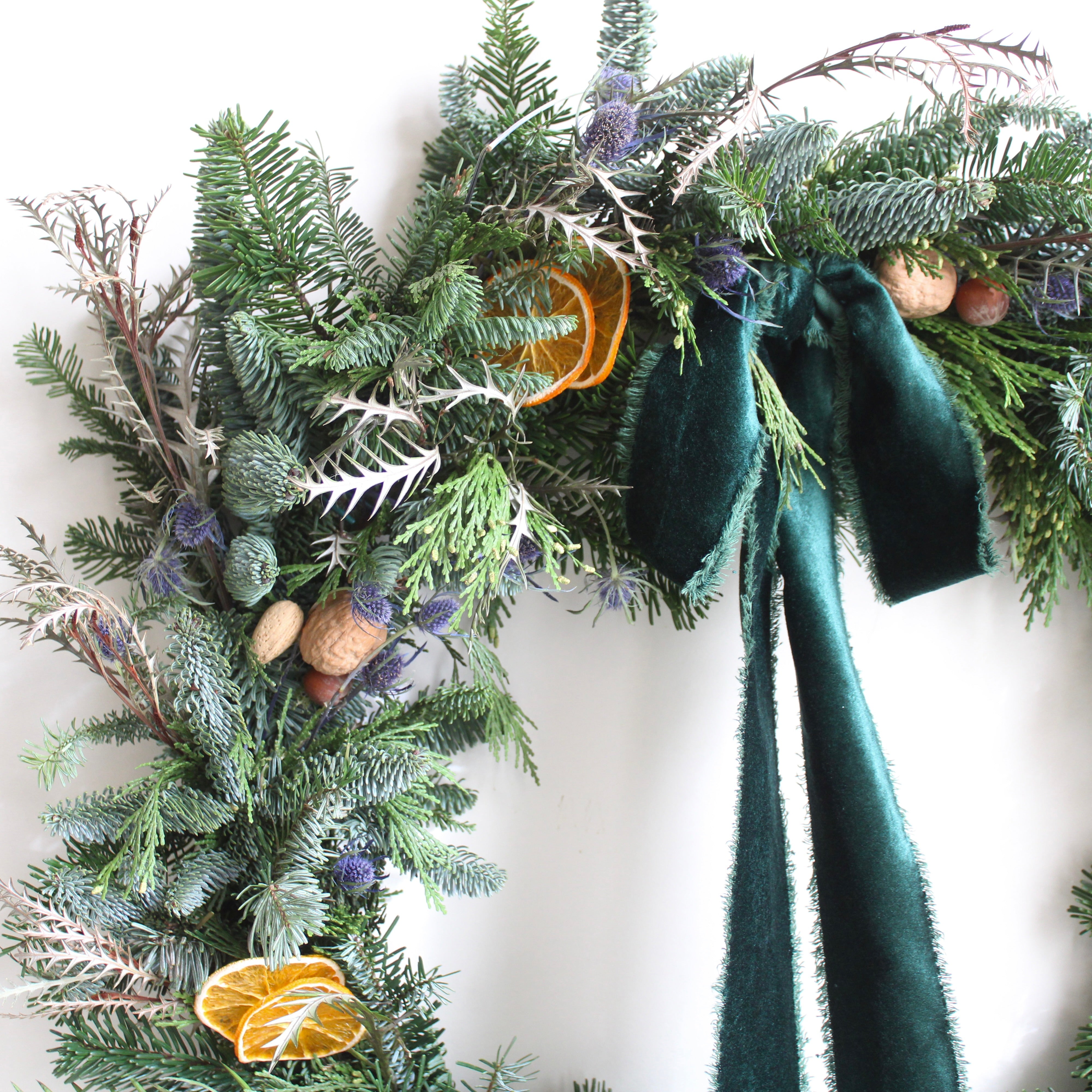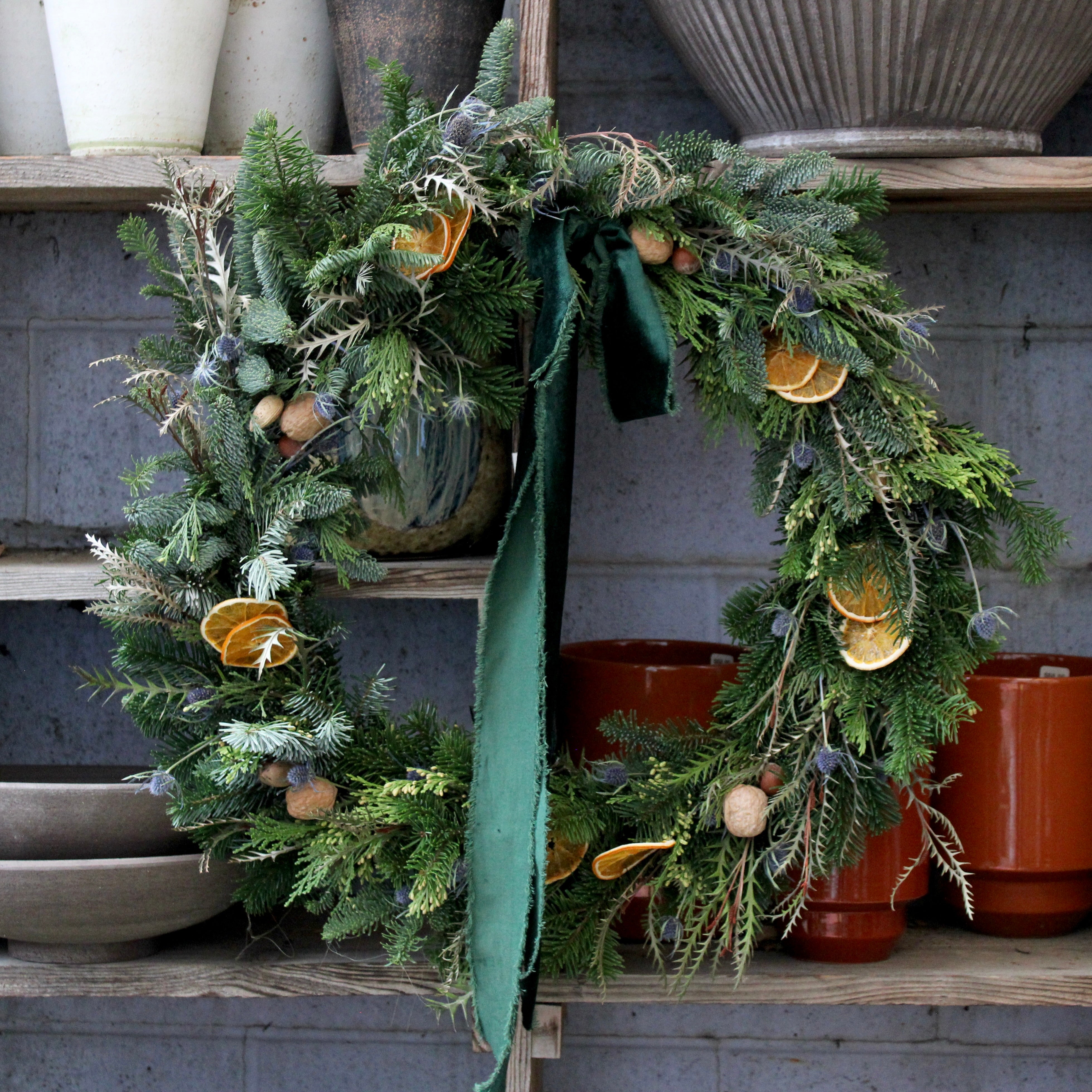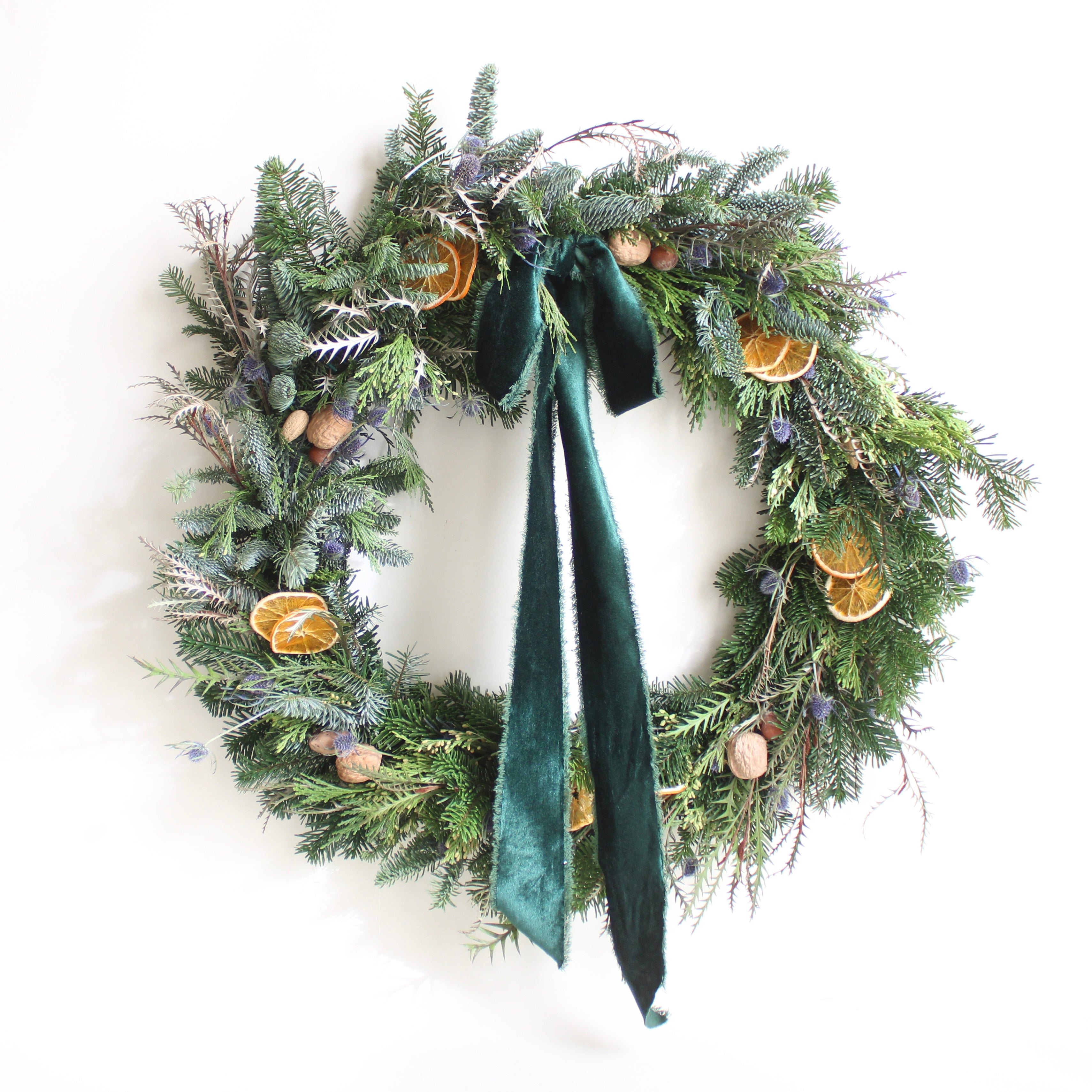 Spruce up your holiday decorating with a fresh evergreen wreath! A fragrant gathering of cedar and pine makes for a stunning base for festive fruits, pods, and ribbon. We love fresh wreaths this time of year and you will too.