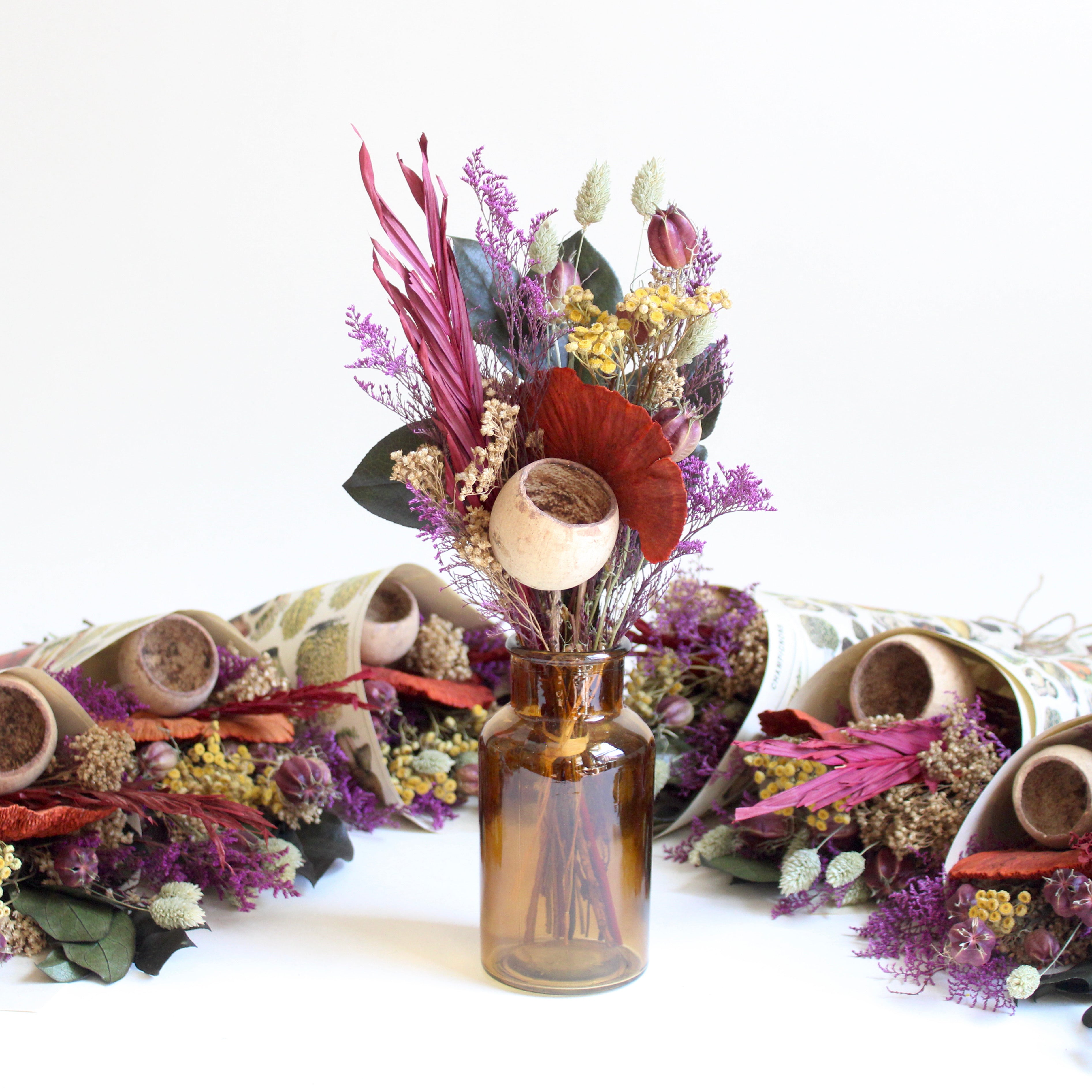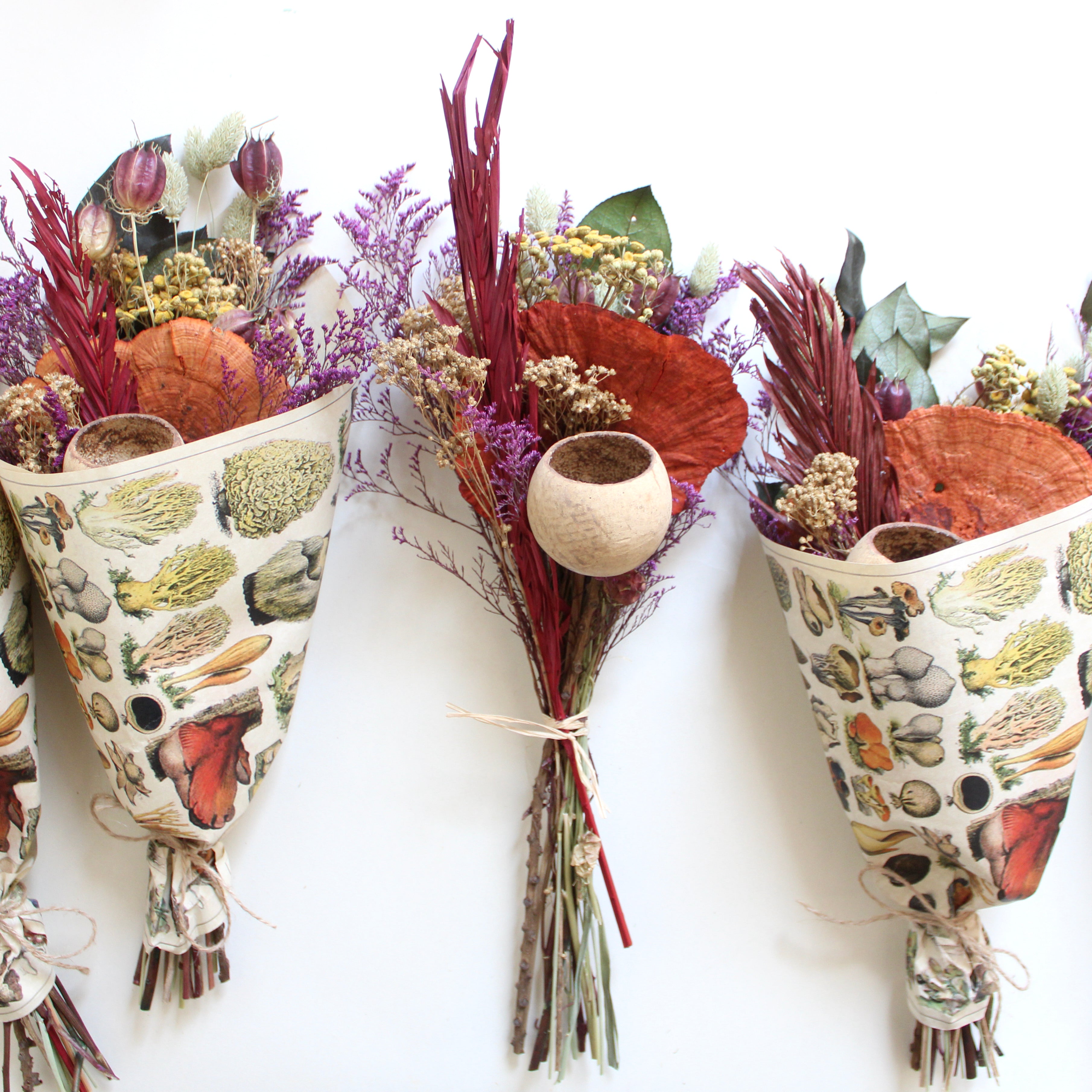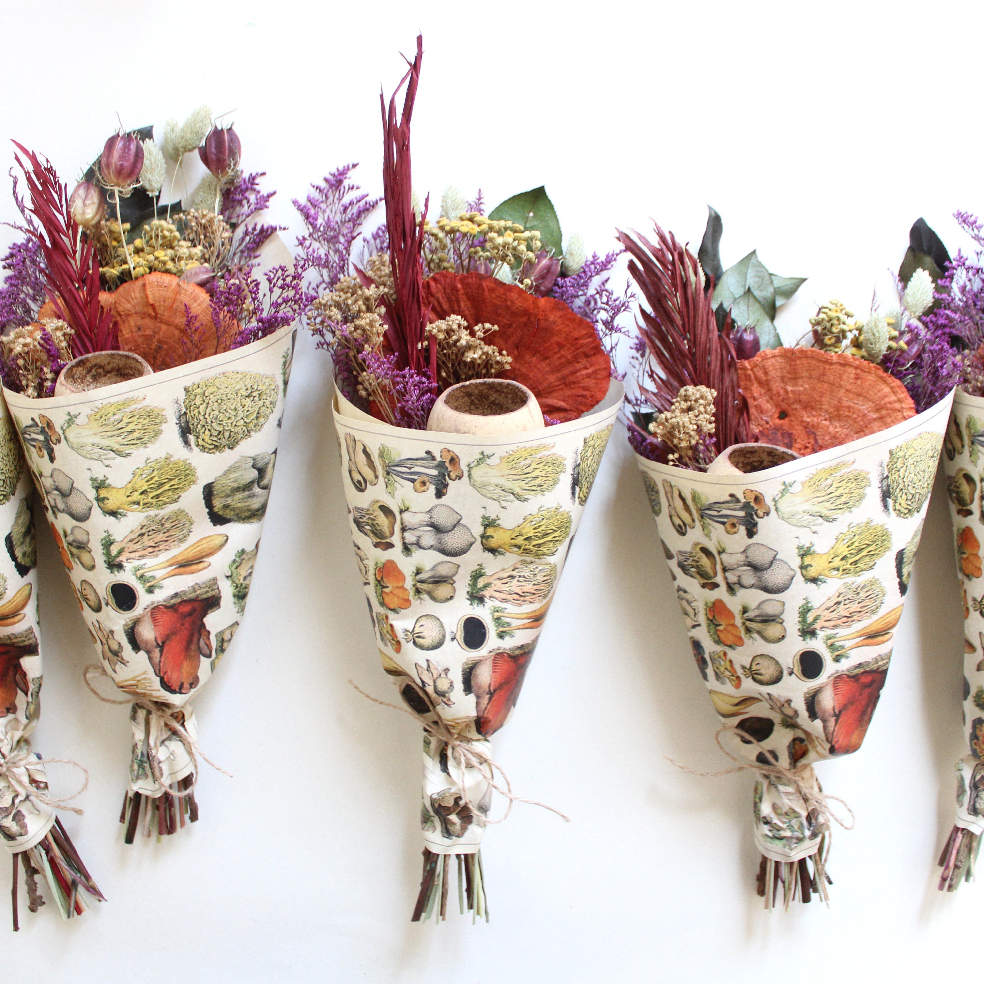 Mushroom Hunting Bouquet features preserved nigella, phalaris, caspia, sponge mushroom, bell cup, salal, broom bloom, and palm frond.