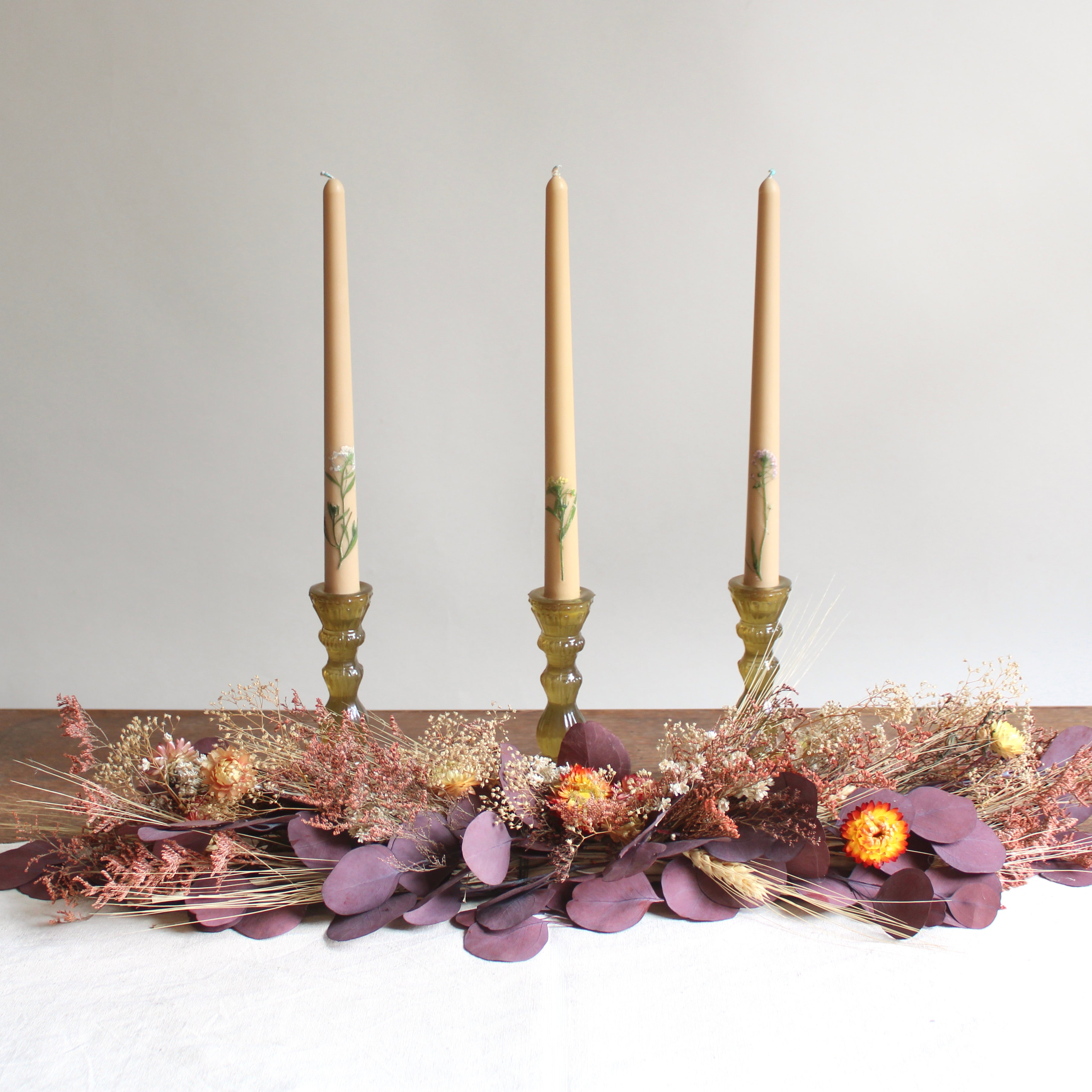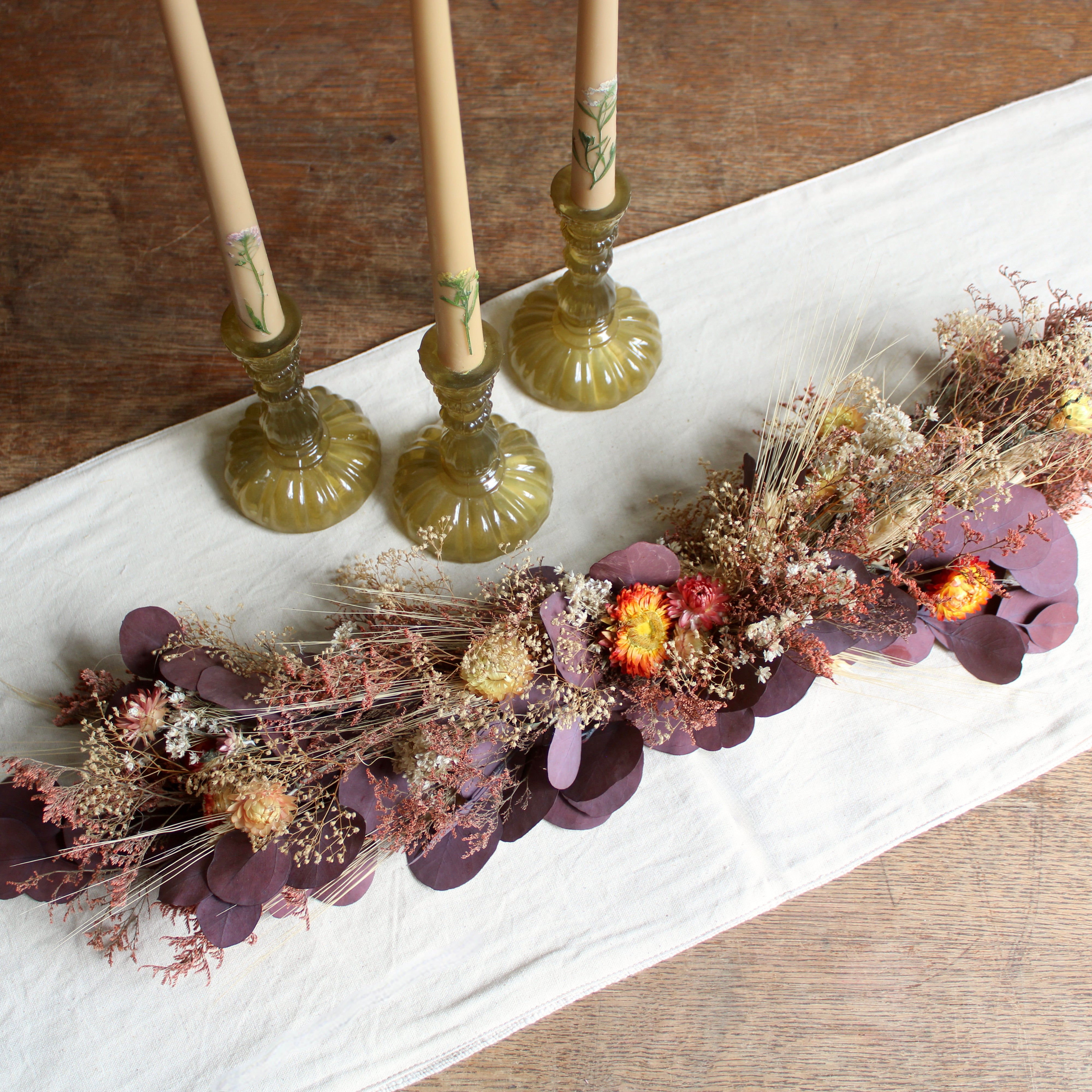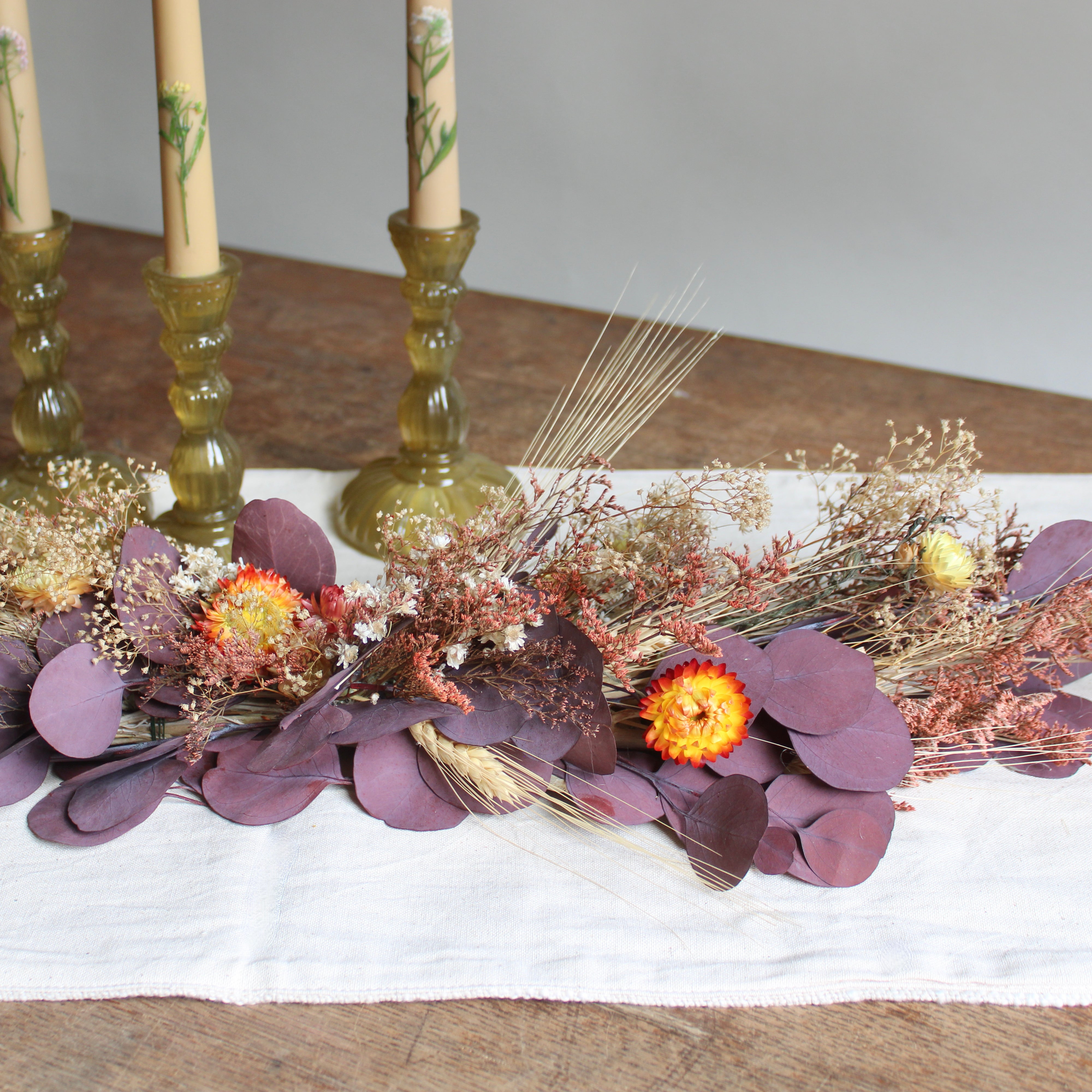 Upstate Harvest Centerpiece features eucalyptus, star flower, wheat, strawflower, broom bloom, and caspia.