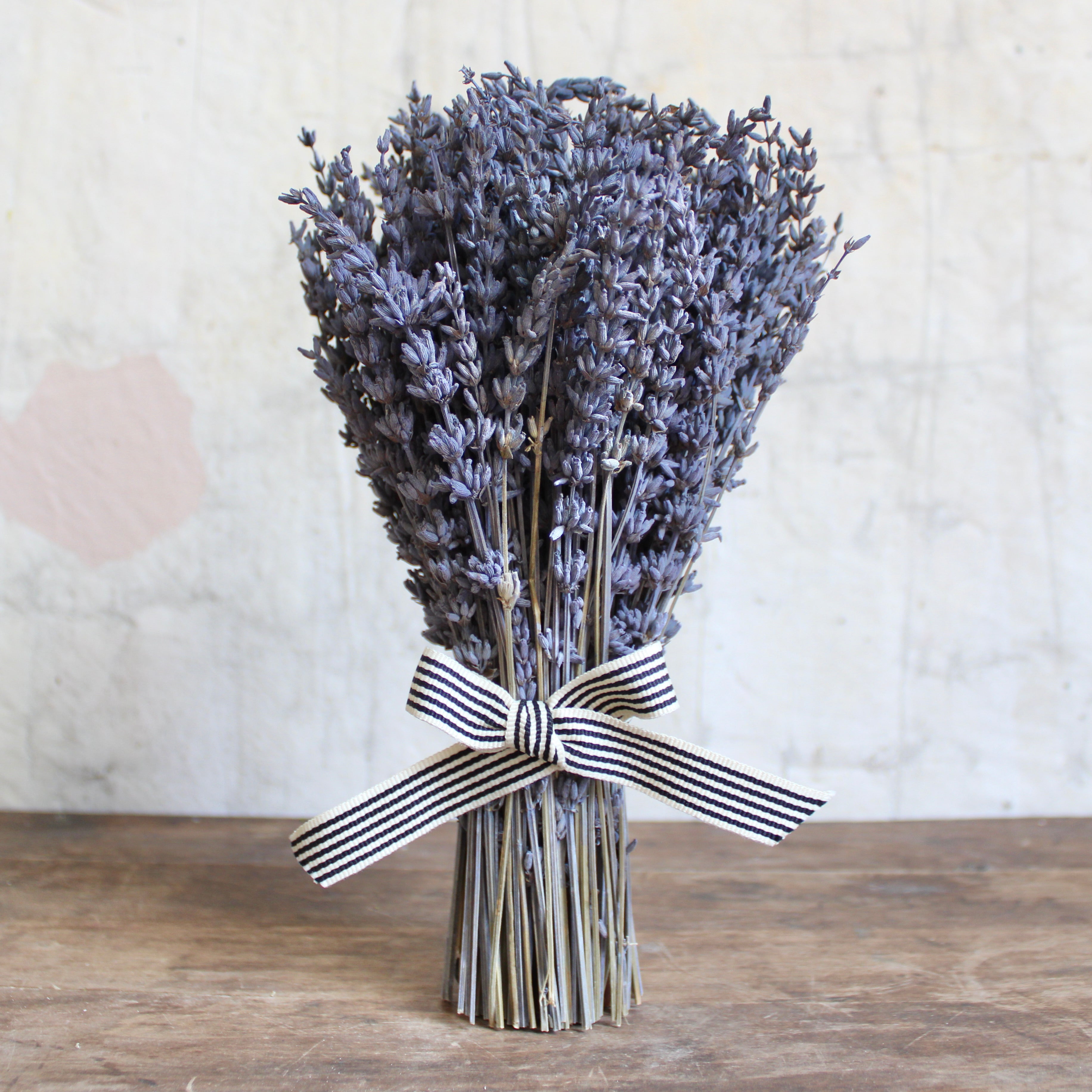 A sweet, standing, bundled and bowed lavender sheaf for bringing a flowery moment to home decor.