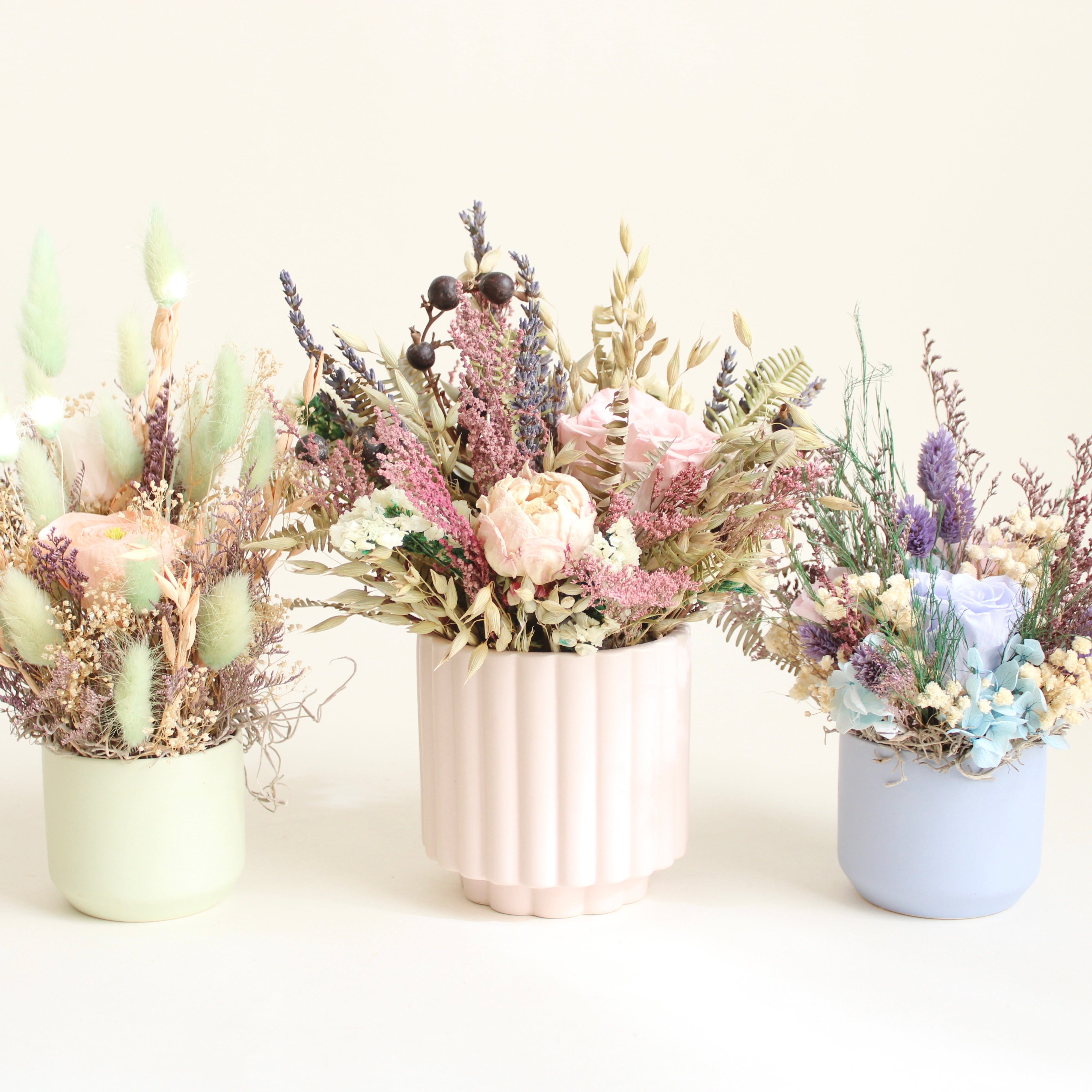 Dried and preserved flowers are mostly care free. The main factors that effect them are light or humidity. Direct sunlight can cause flowers to fade, and moisture can be absorbed and make certain flowers "wilt". If they end up getting dusty, we recommend canned air or a blow dryer on a low cool setting.