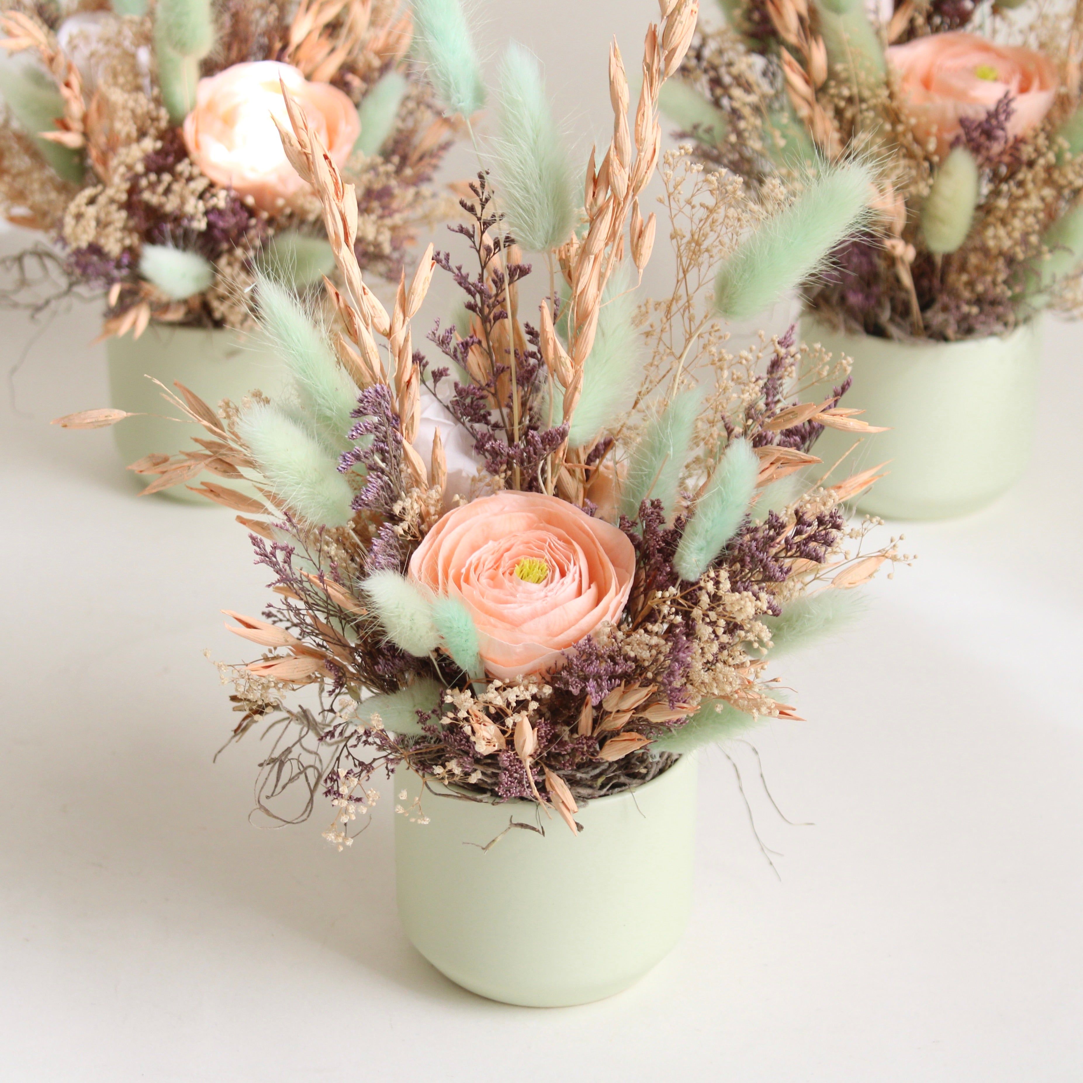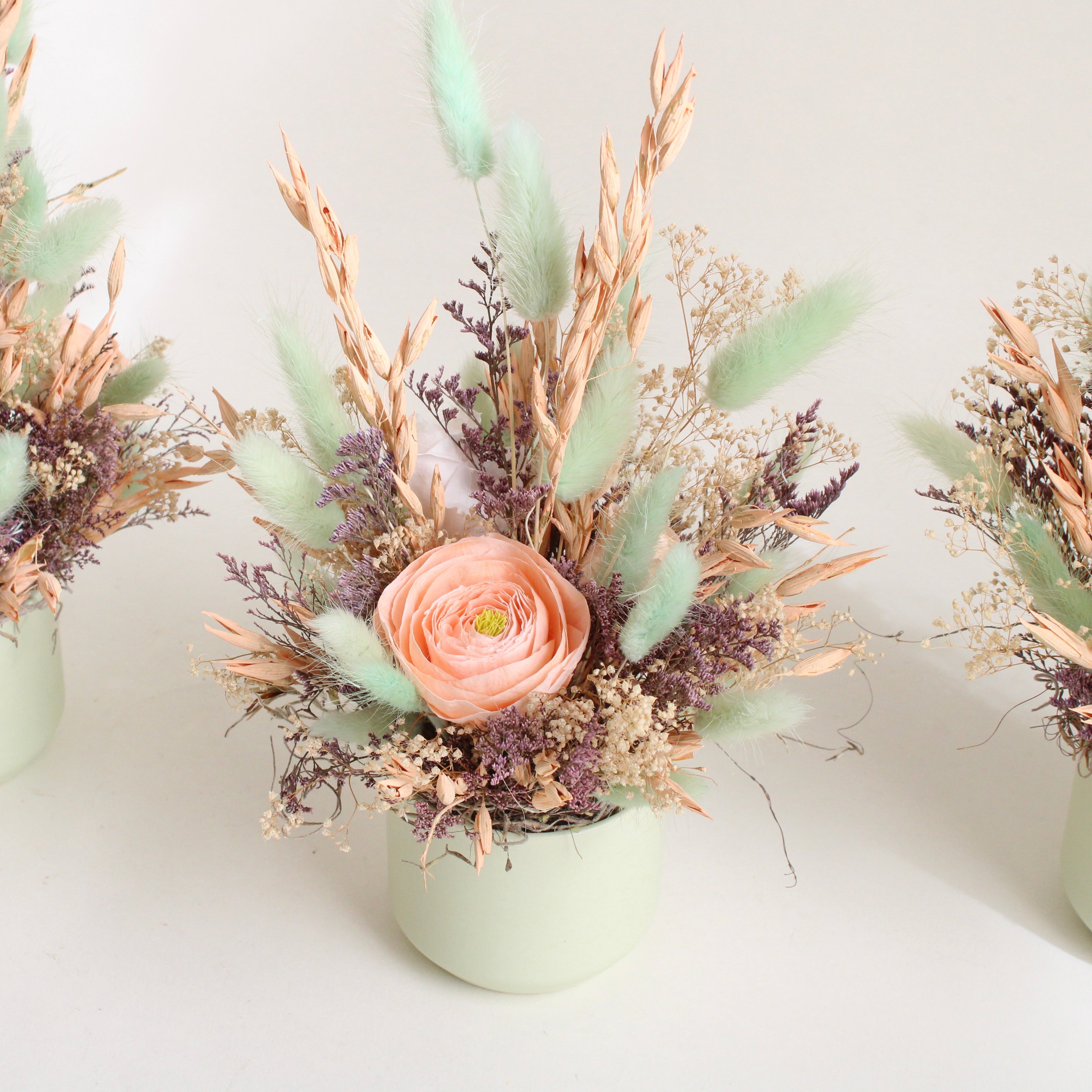 Spring Peach Arrangement features bunny tail, avena, caspia, gypsophila, and preserved roses.